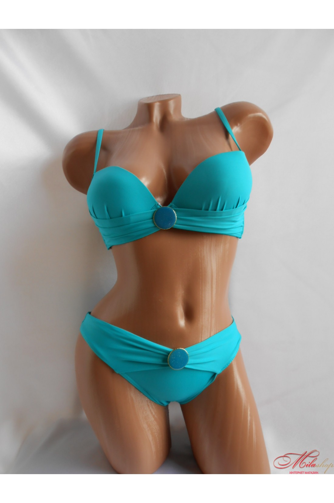 Шикарный раздельный купальник со съемным пуш-апом. Бюстгальтер и трусики украшены пуговицей в тон купальнику. Классические трусики со средней линией талии. Идеальная посадка, невыгорающий цвет.