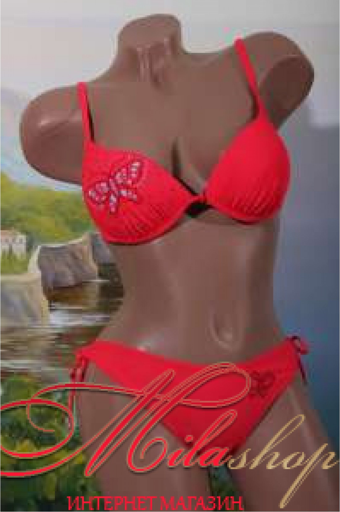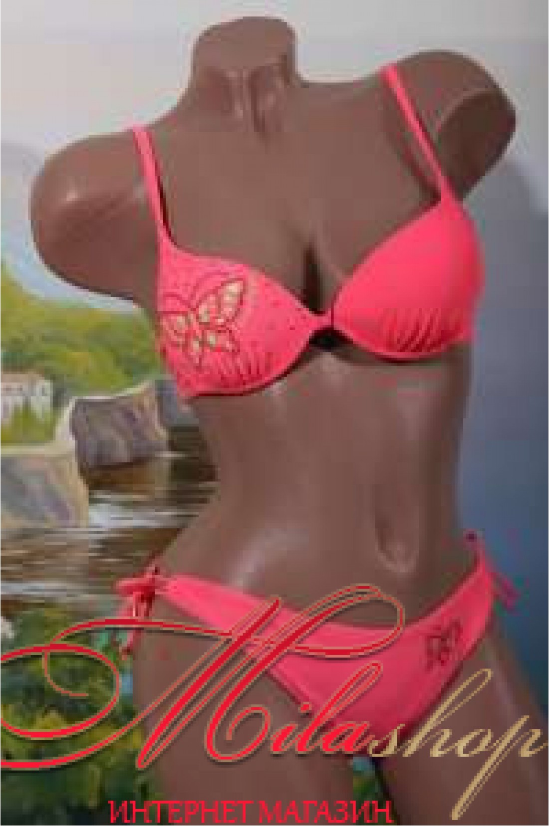 Стильный молодежный купальник с формованными чашками, со съемным пуш-апом. На одной из чашек бюстгальтера декор из камней в виде бабочки. Трусики слип с низкой линией талии, с кулисками по бокам. Размер европейский.