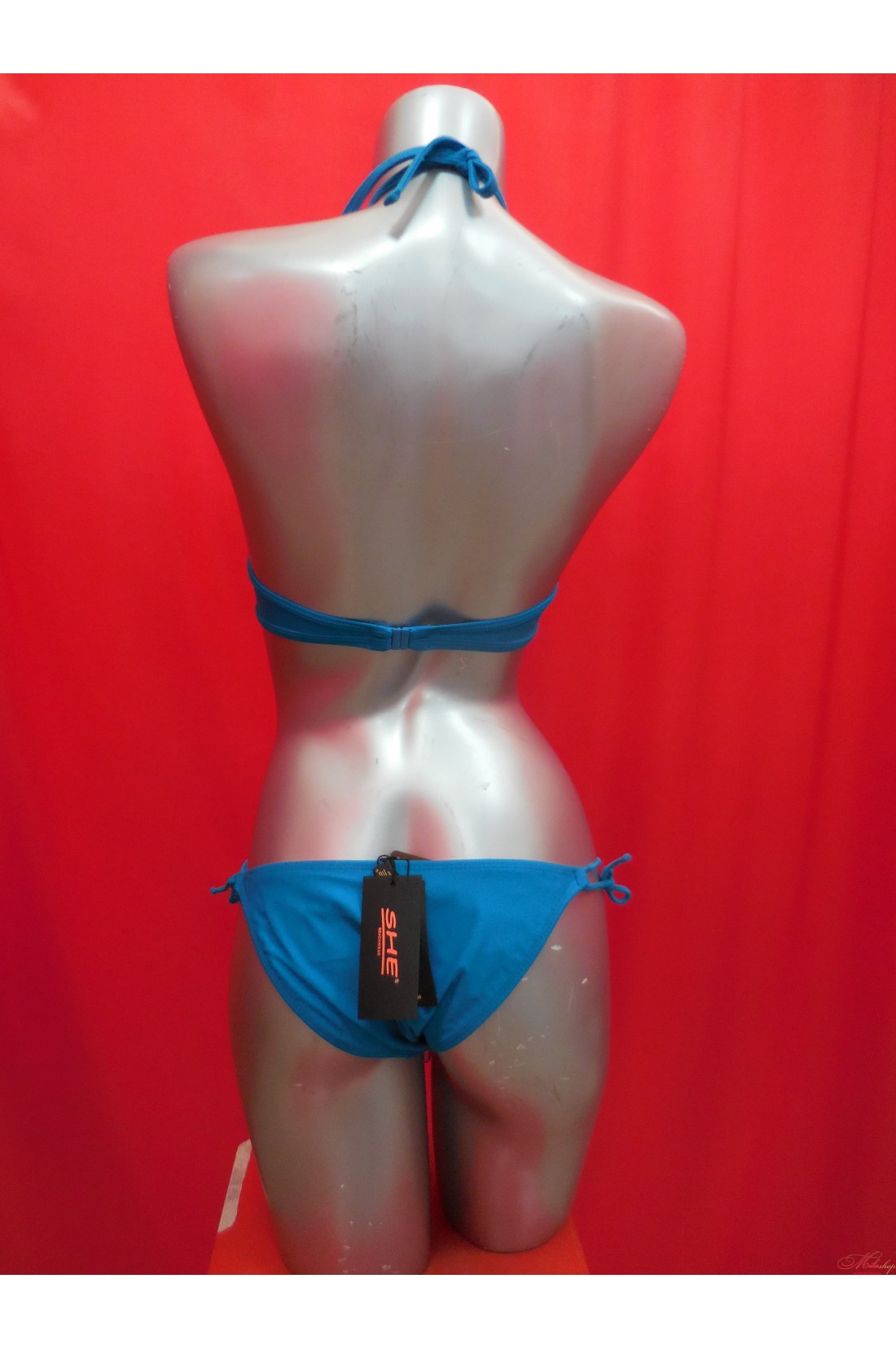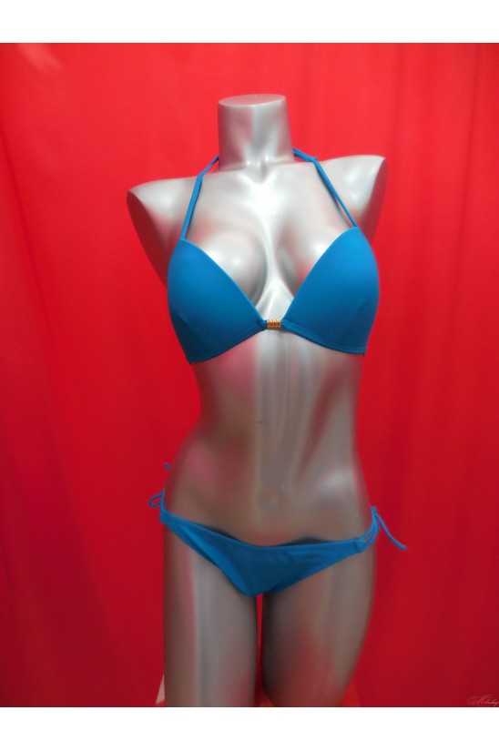 Купальник с лифом-бикини. Плотные чашки с вынимаемыми вкладышами пуш-ап. Завязывается на шее и застегивается сзади. Вырезанные трусики, с завязками по бокам.
