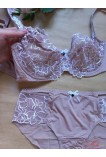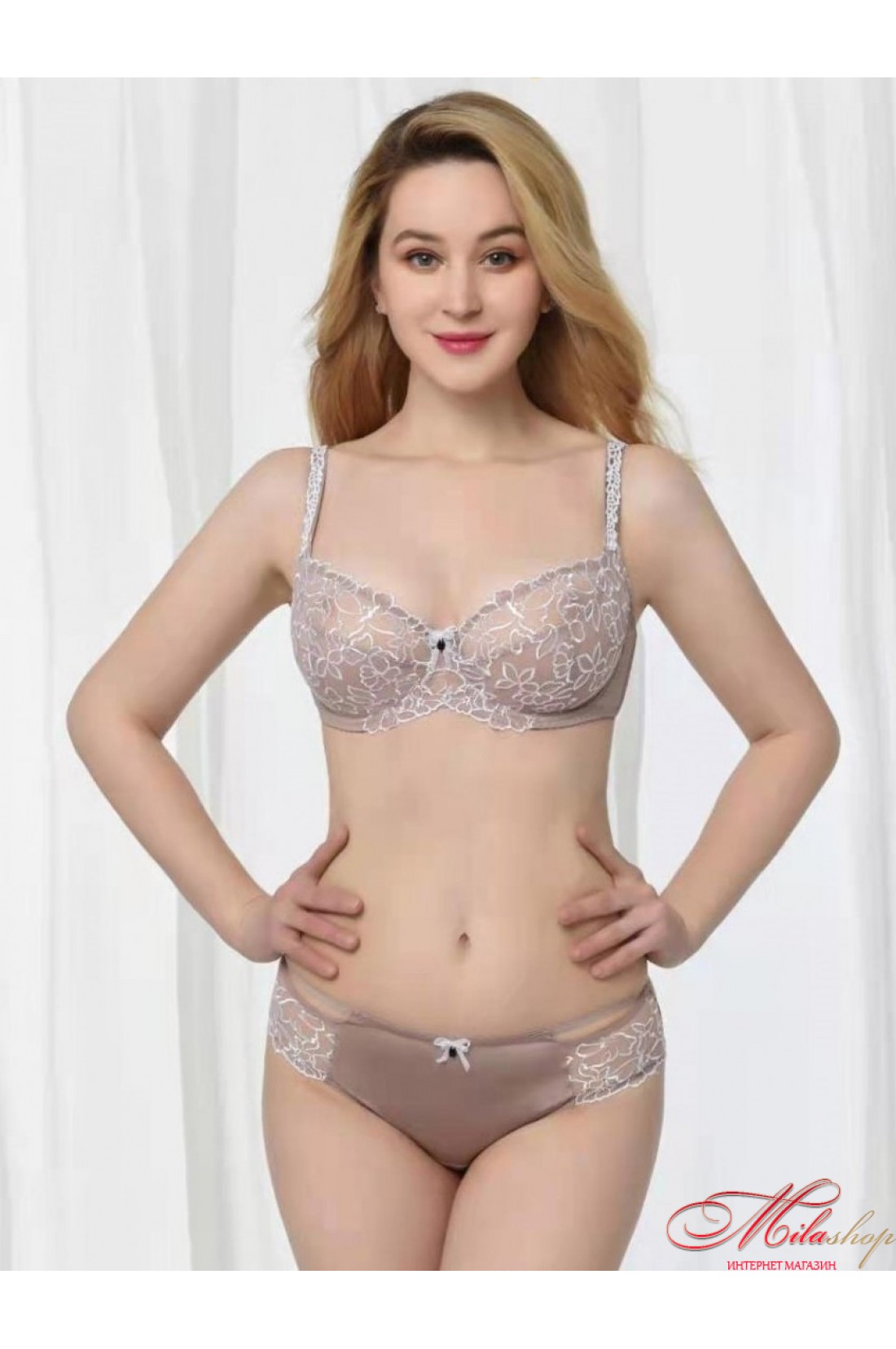 Легкий комплект з м'якими чашками на кісточках, які зближують та піднімають груди. Бретели не знімні, регулюються по довжині. Пояс бюстгальтера гладкий, усередині з мікросіточкою, з боковою кісточкою для кращої підтримки. Трусики-сліп виконані з мікрофібри та м'якої мікросітки з вишивкою. Середня лінія талії. Задня деталь з мікросітки з вертикальним швом не виділяється під одягом.