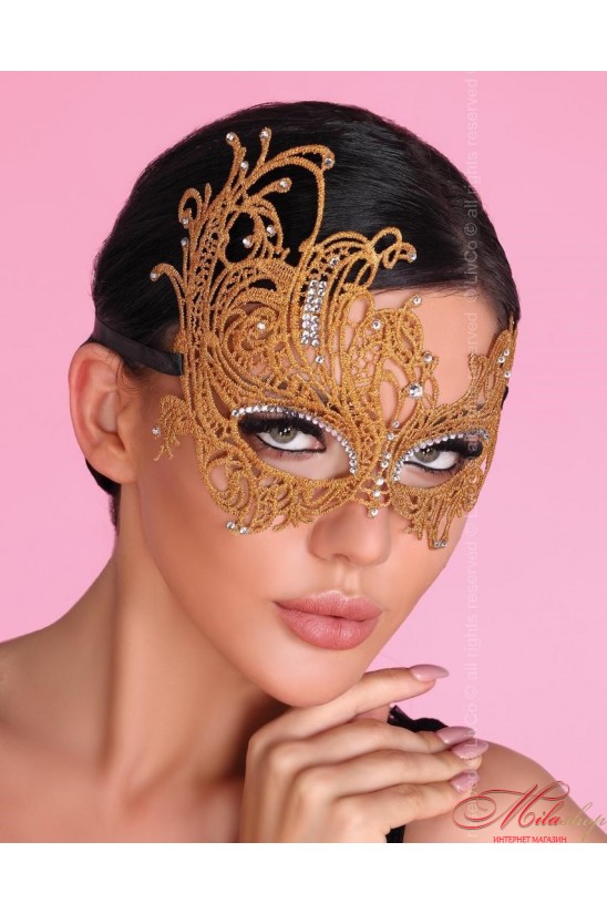 Изысканная гипюровая маска золотого цвета с декором из кристаллов, придающая загадочности и экстравагантности, завязывающаяся сзади на ленты.
