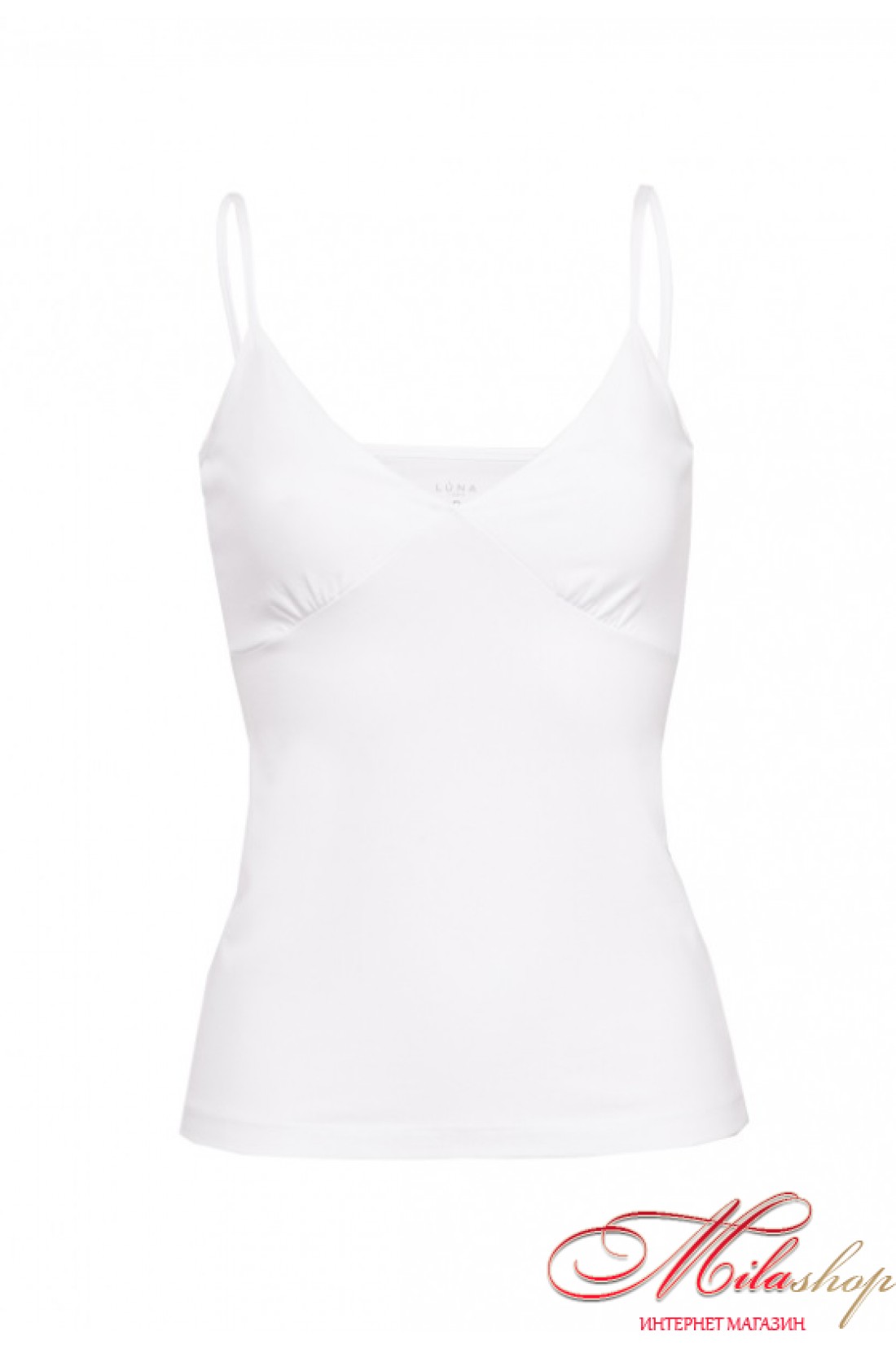 Майка жіноча на тонких бретелях з трикутними виточками для грудей. Гладка приталена майка з глибоким декольте. Майка має бічні шви. Складається з комбінованого матеріалу (95% бавовна, 5% еластан).