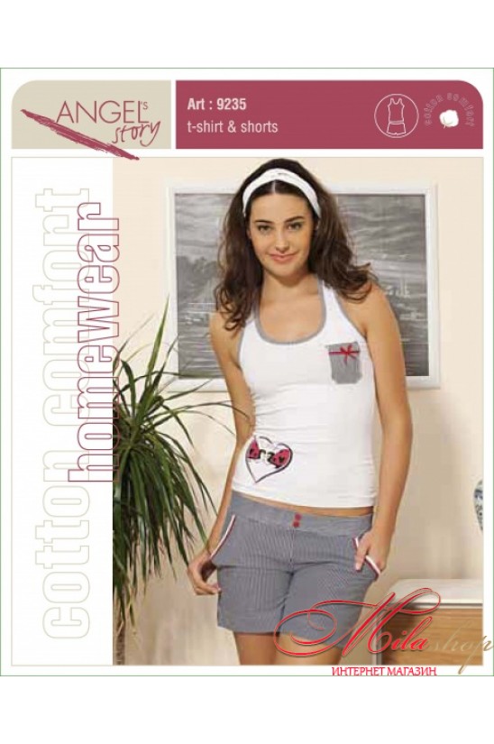 Стильный комплект для сна состоит из майки на широких бретелях и шорт. Выполнен из высококачественного хлопкового полотна. Майка белого цвета гармонично сочетается с полосатыми шортиками. Шортики с карманчиками,