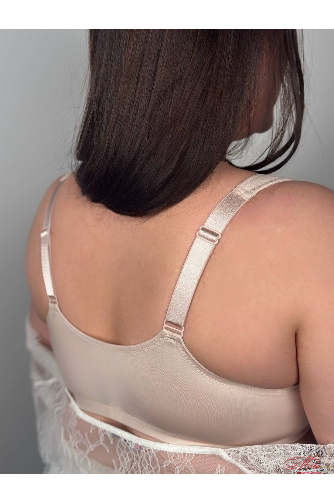 Бра-топ із гладкого жаккардового полотна зі вставкою з мікросітки, м'які чашки без кісточок підтримують груди і не додають об'єм, не здавлюють, широкі бретелі не відстібаються, регулюються по довжині, спереду застібається гачками.