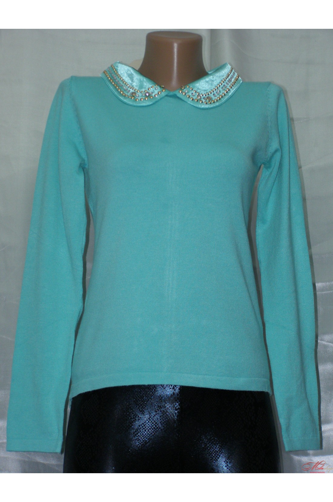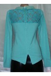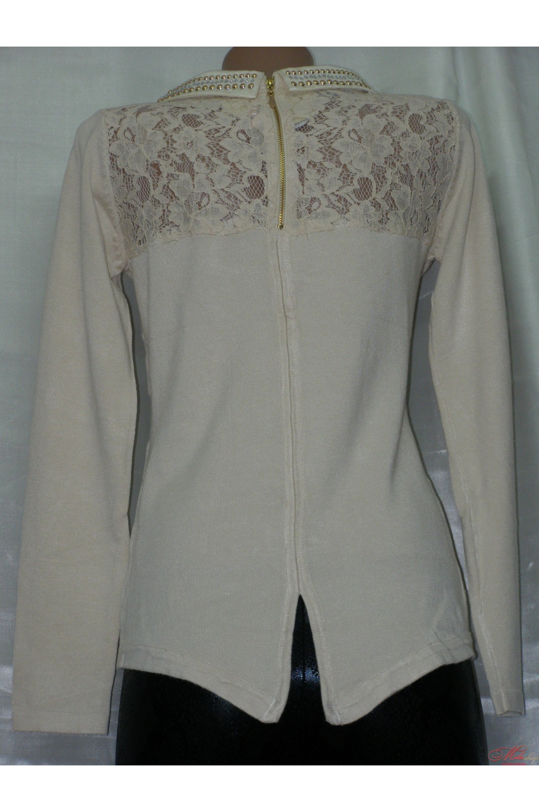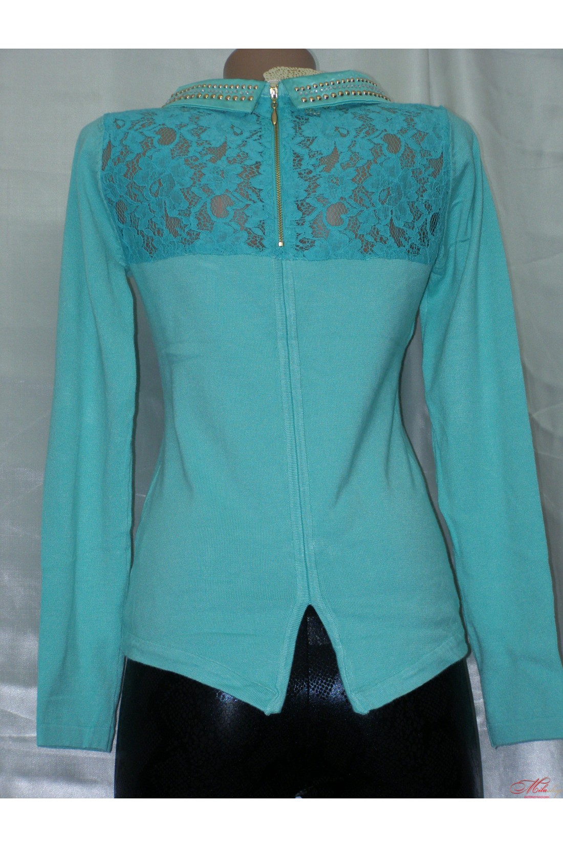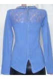 Молодежная кофта актуального пошива. Воротник из нежного атласного полотна, декорирован металлическими элементами и камнями. Спинка украшена вставкой из нежного кружева и змейкой. Оригинальности добавляет удлиненная задняя часть с разрезом.