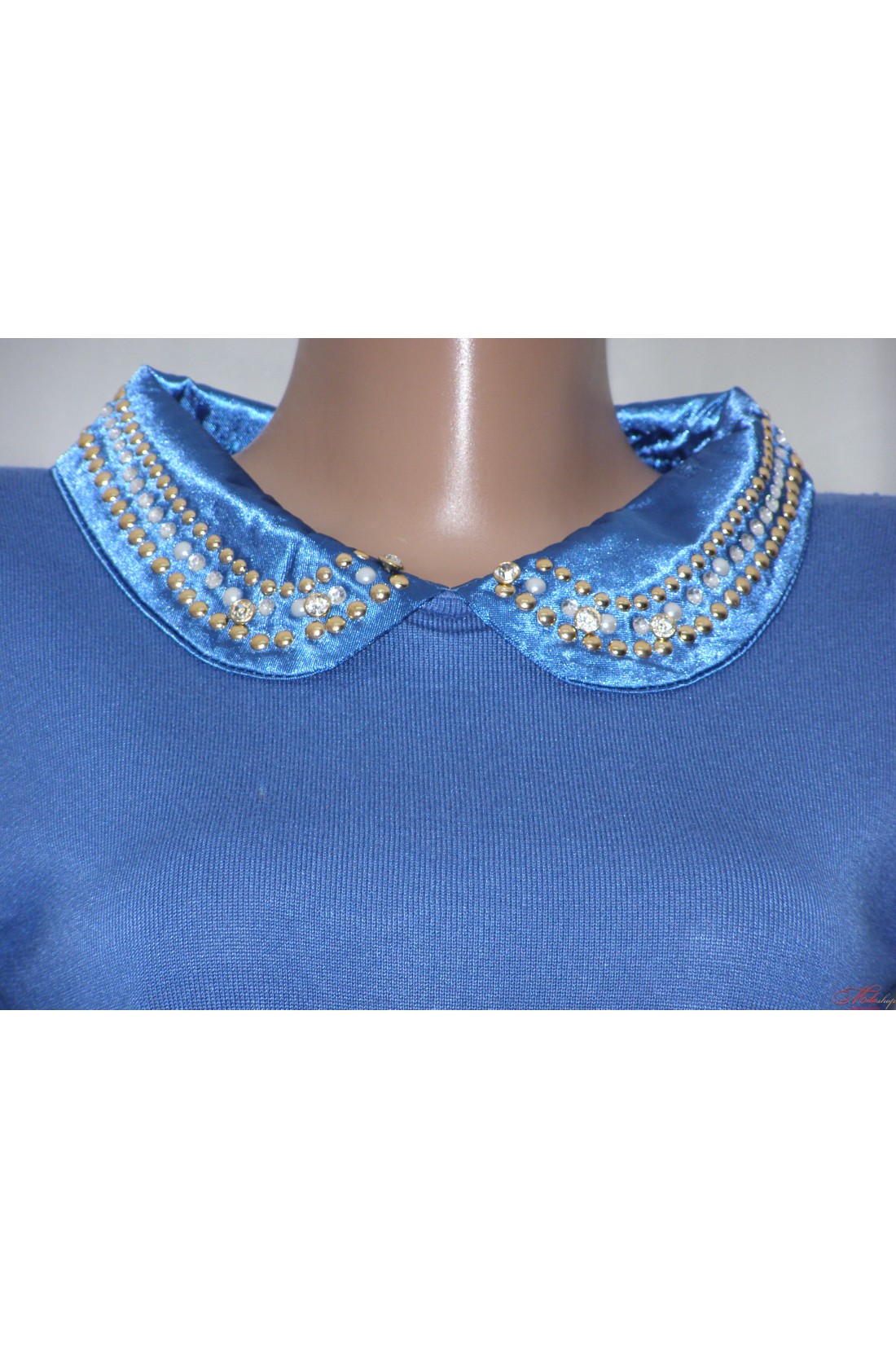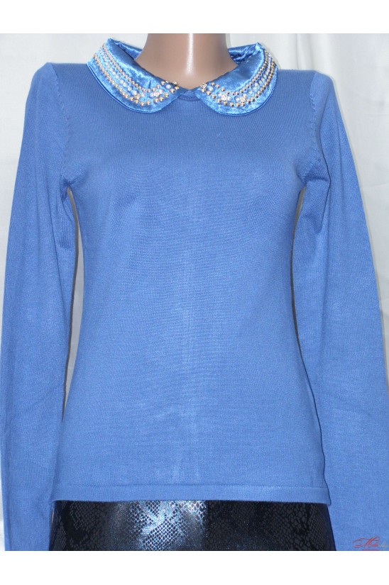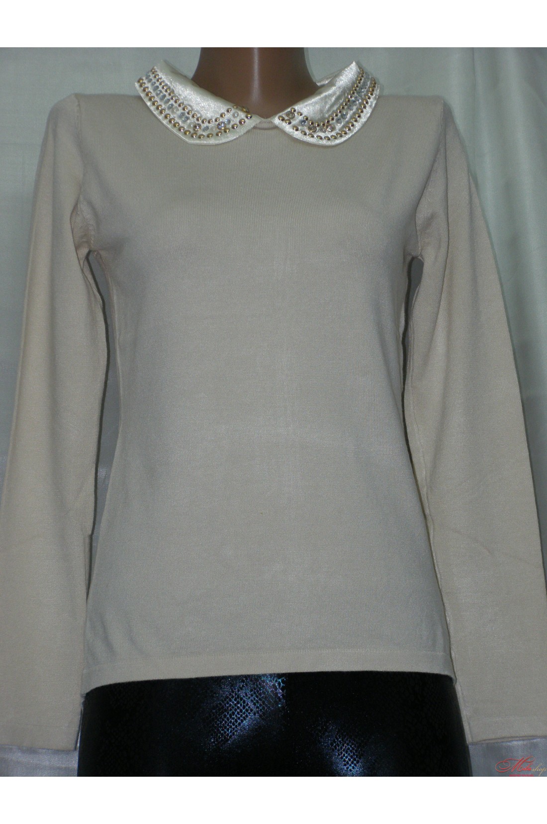 Молодежная кофта актуального пошива. Воротник из нежного атласного полотна, декорирован металлическими элементами и камнями. Спинка украшена вставкой из нежного кружева и змейкой. Оригинальности добавляет удлиненная задняя часть с разрезом.
