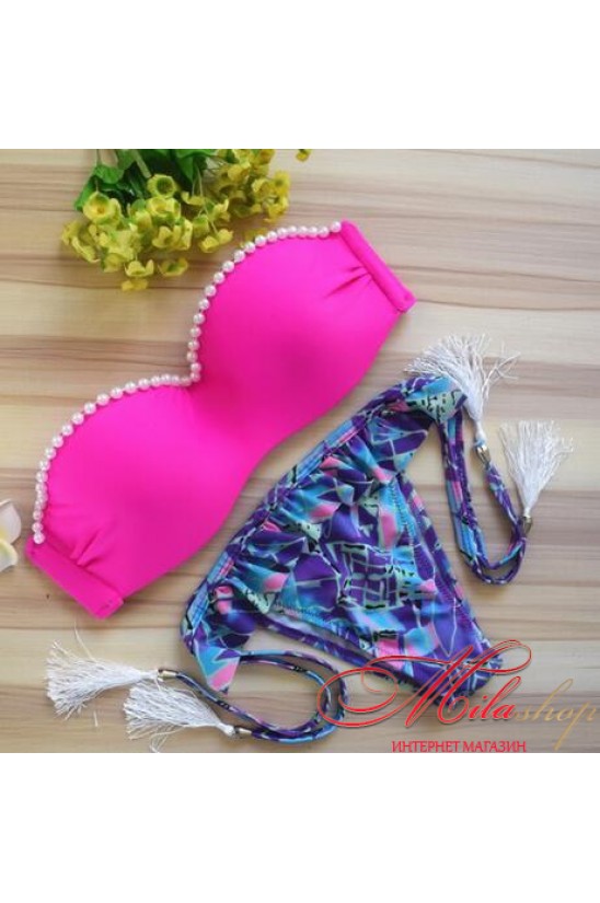 Купальник из высококачественного, бстросохнущего полотна. Чашки бюстгальтера с не большим пуш-апом. Трусики-бразилиана, на завязках.