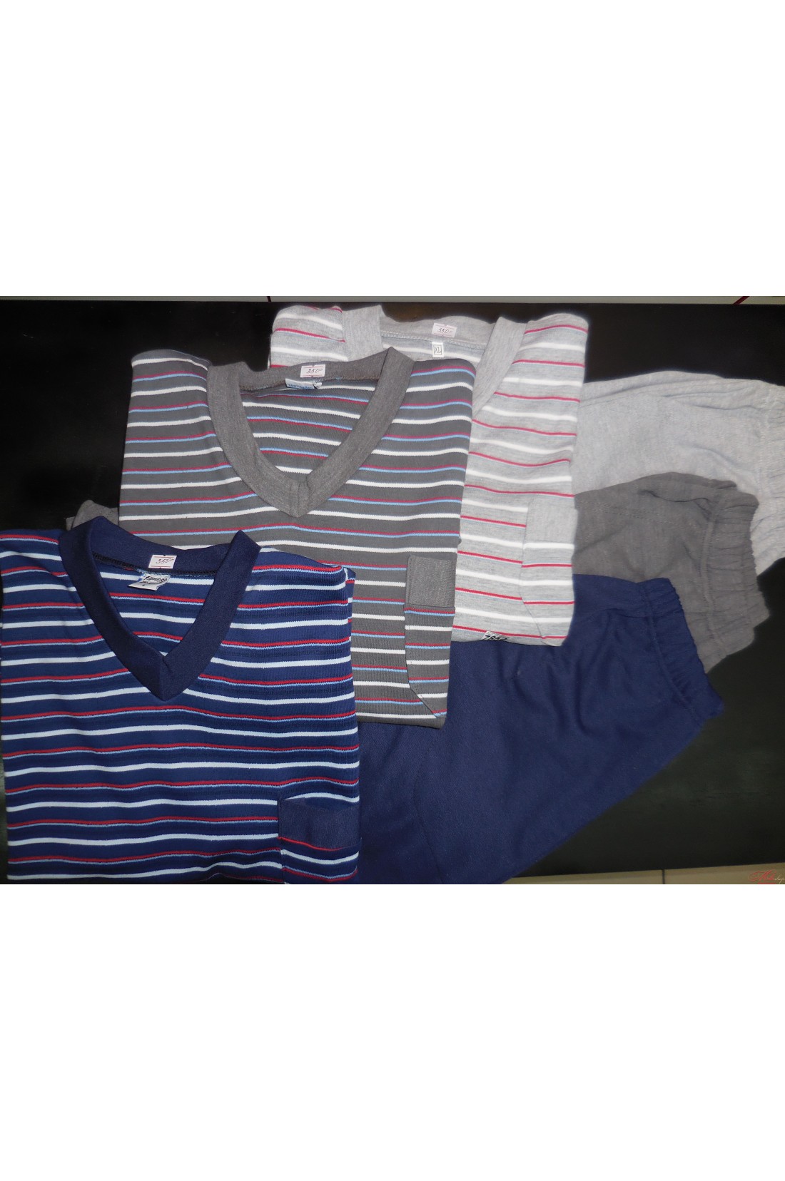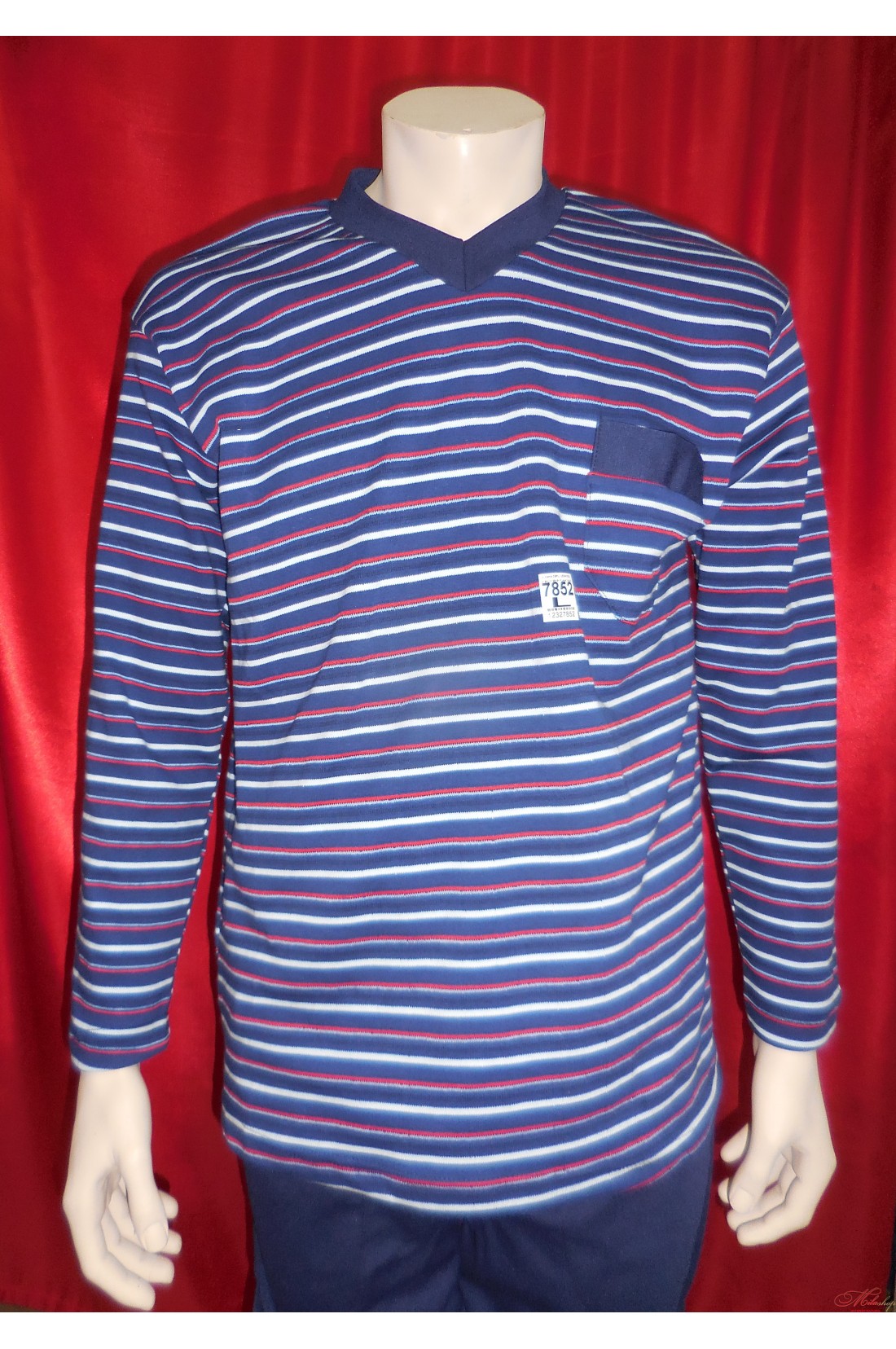 Удобная и комфортная мужская пижама сделана из натуральной хлопковой ткани. Футболка с длинными рукавами имеет V-образный вырез горловины и карман на груди. Длинные прямые брюки с эластичным поясом.