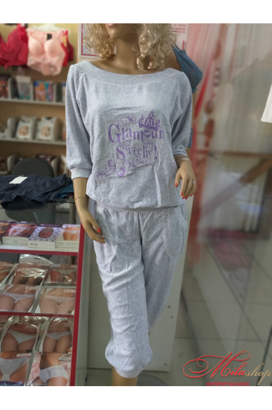 Комфортный велюровый костюм. Рукав три четвертых, бриджи на резинке. На груди вышивка, декор - стразы.