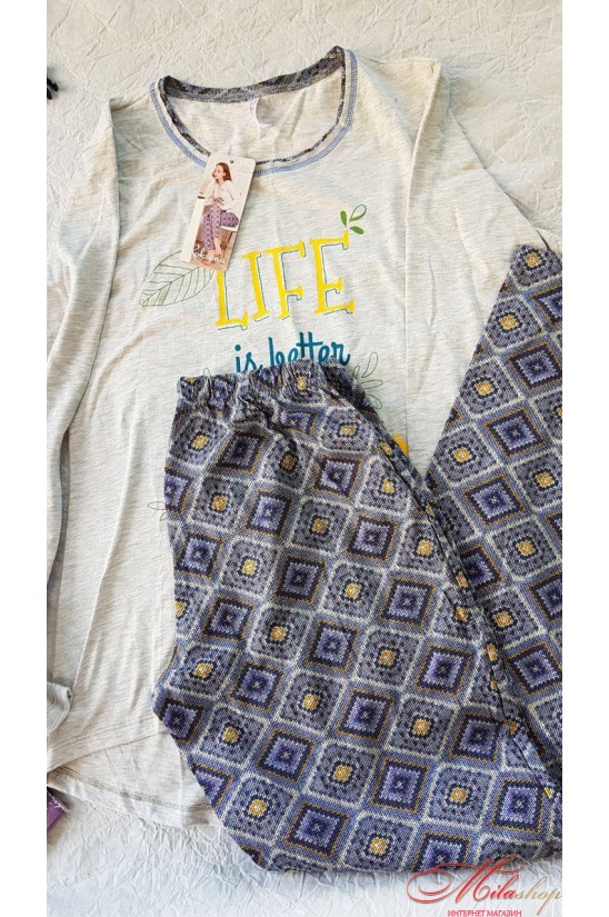 Изумительная хлопковая пижама. Состоит из джемпера с длинным рукавом и надписью и брюк. Брюки прямые с ярким принтом.