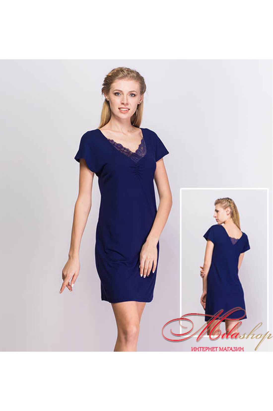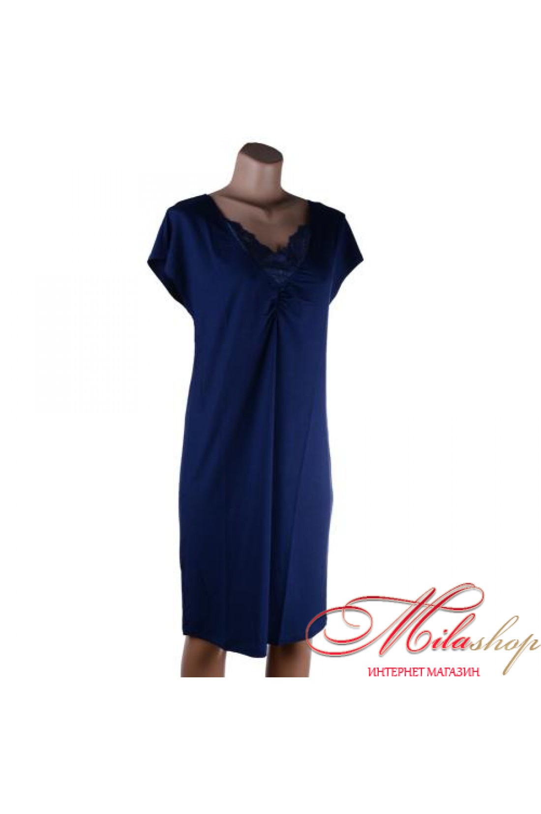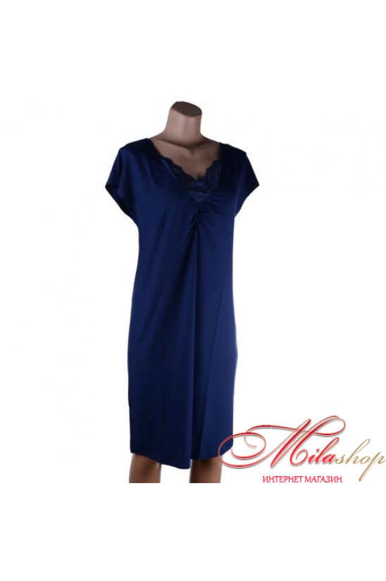 Качественная элегантная сорочка синего цвета, длинна до колена. Спереди вставка из кружева, короткий рукав.