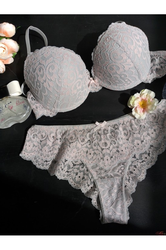 Очаровательный комплект нежного цвета. Состоит из бюста и трусиков слип. Бюстгальтер имеет встроенный пуш-ап, несьемные бретели, регулируются. Трусики слип выполнены из изумительного двухцветного кружева.