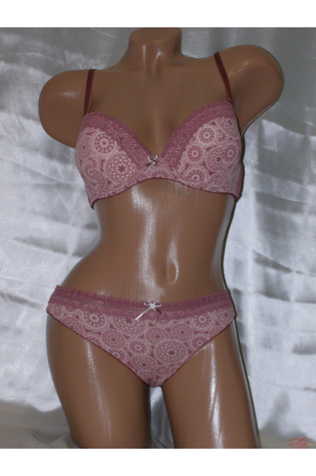 Комплект нижнего белья с оригинальным узором, выполнен из эластичного принтованого полотна. Состоит из бюстгальтера с эффектом пуш-ап и классических трусиков с низкой линией талии.