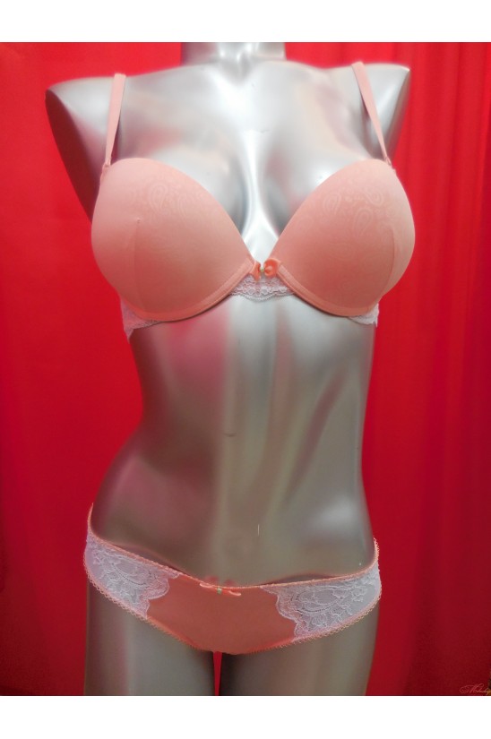 Бюстгальтер с эффектом пуш-ап, с х/б подкладкой изнутри. Гладкая чашка. Трусики стринги с низкой линией талии.
