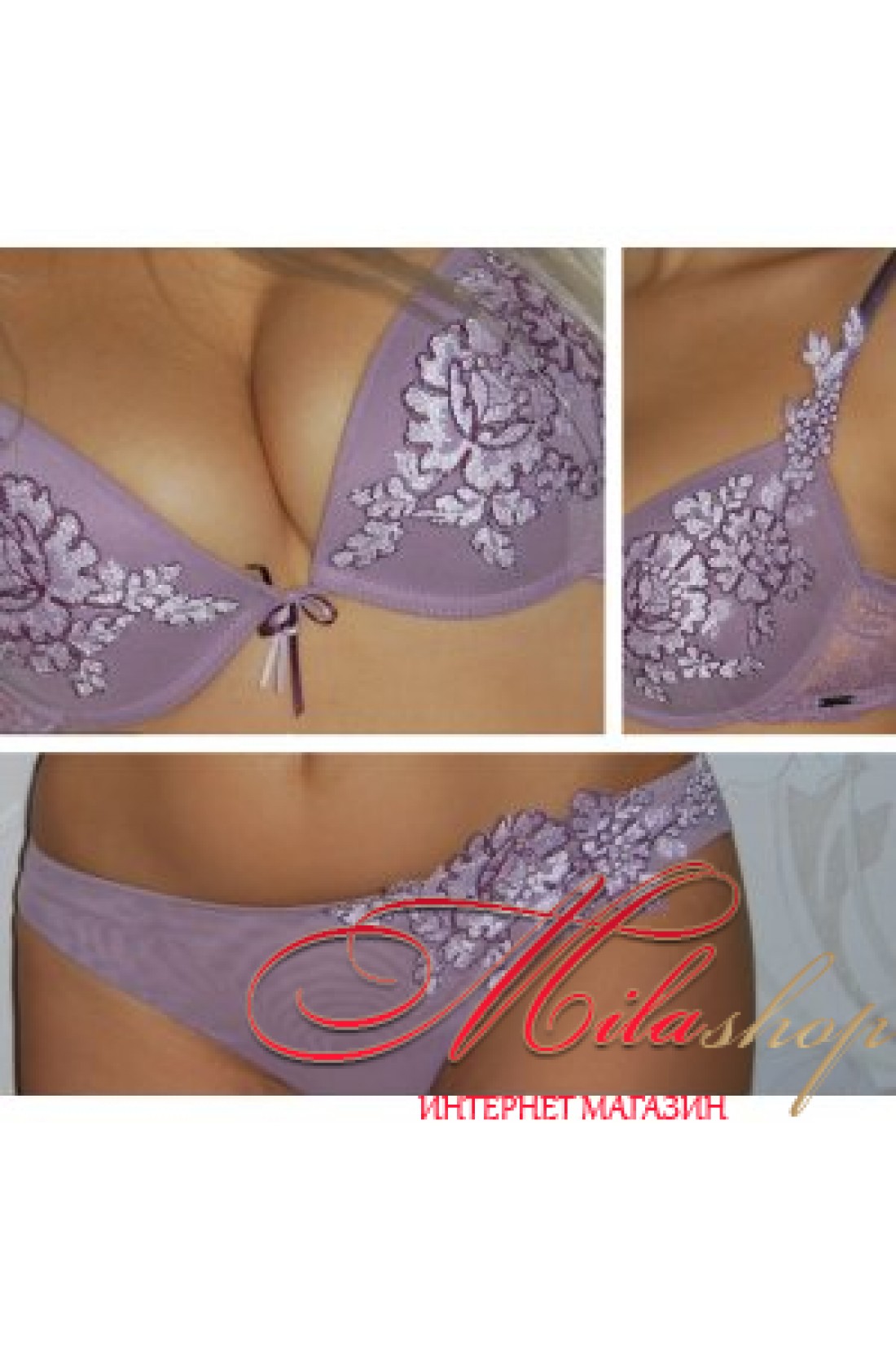 Комплект нижнего белья состоит из бюстгальтера с гелевым пуш-апом и трусиков-бразилиана, с кружевной задней частью. Комплект украшен цветочной вышивкой.