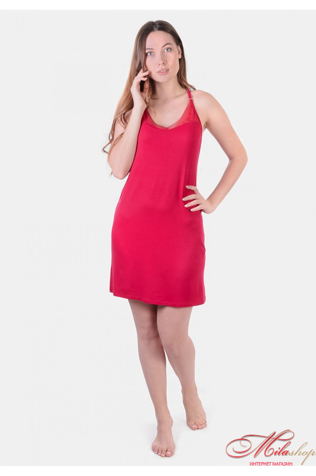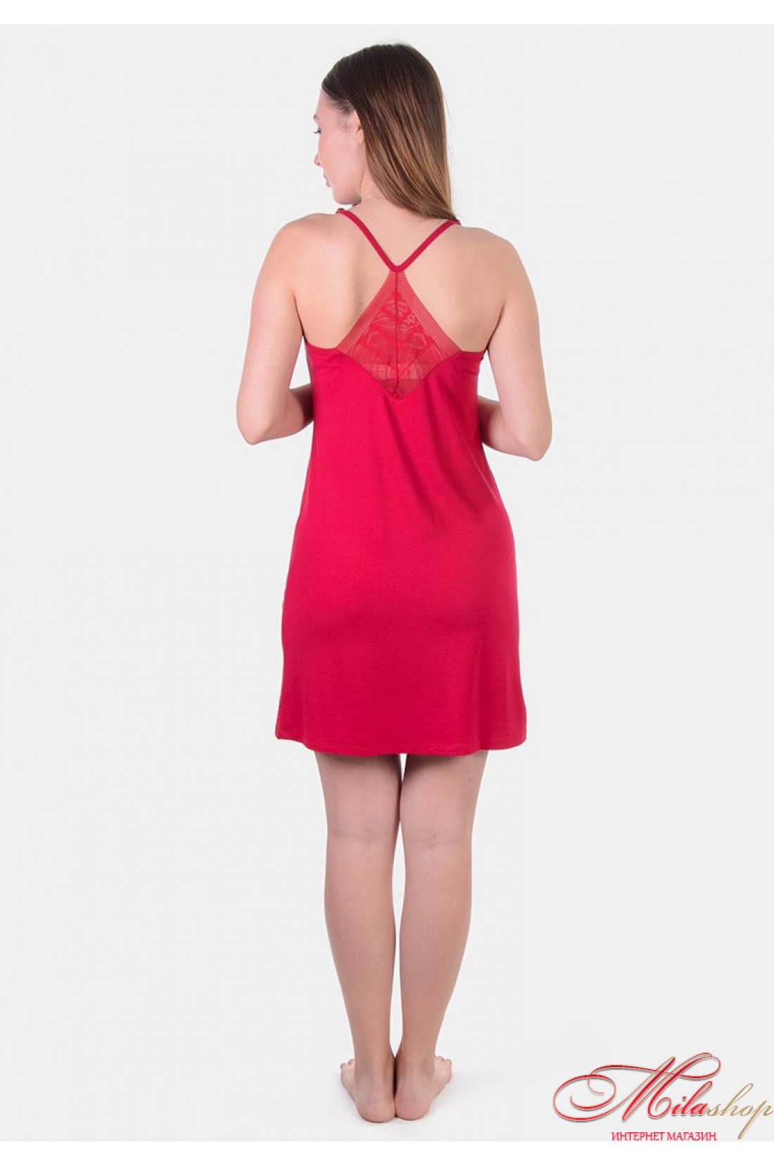 Нічна сорочка прямого крою на тонких бретелях, що регулюються. Виконана з найніжнішої віскози та м'якого мережива. Спинка-борцювання.