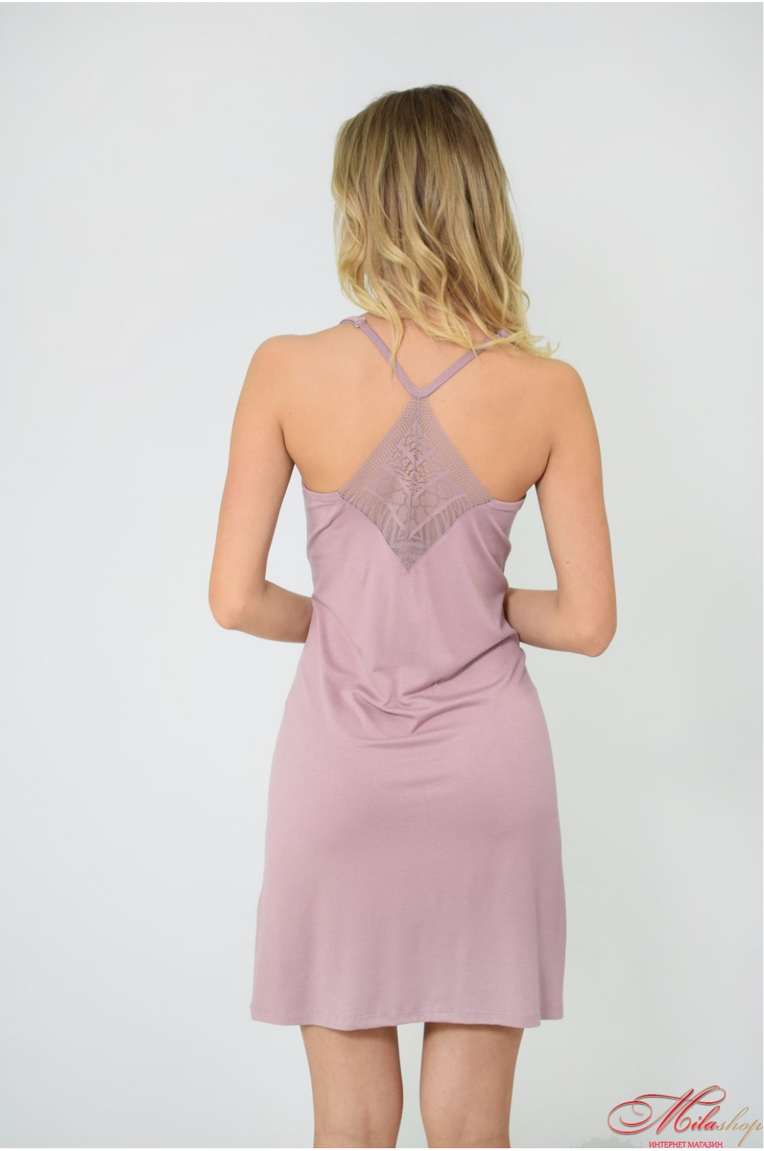 Нічна сорочка прямого крою на тонких бретелях, що регулюються. Виконана з найніжнішої віскози та м'якого мережива. Спинка-борцювання.