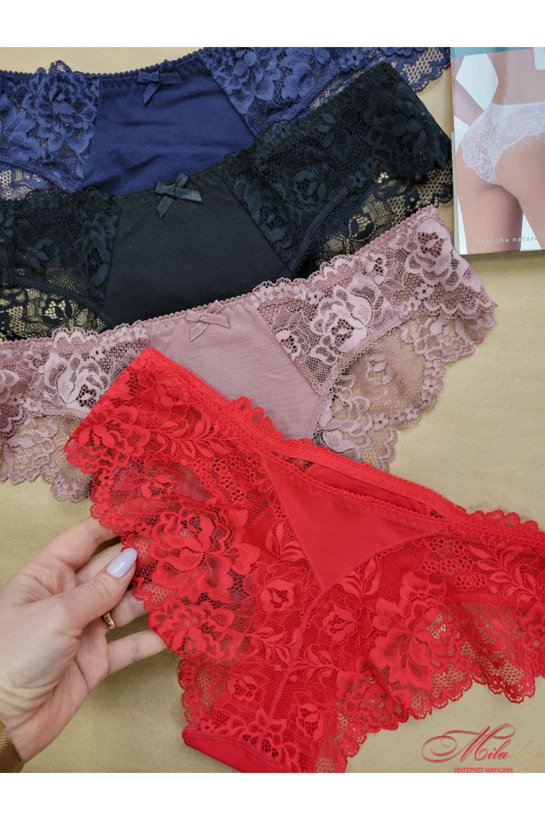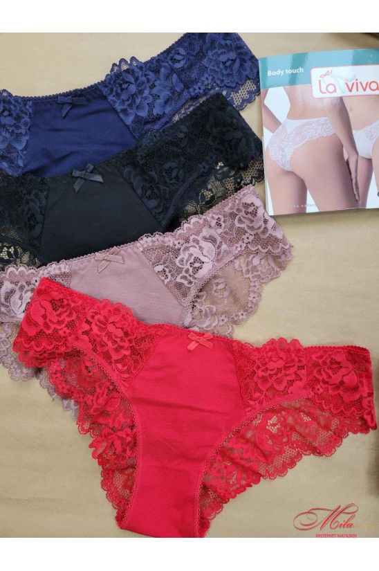 Трусики виконані з бавовни у поєднанні з ніжним мереживом. Із середньою лінією талії. Задня деталь із мережива з вертикальним швом, що вигідно підкреслює форми.