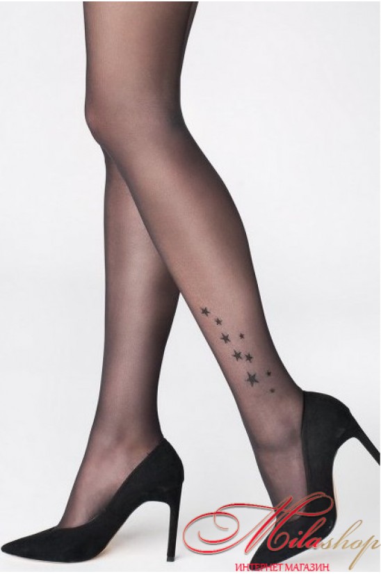 Фантазійні тонкі колготки щільністю 20den, що імітують на лівій щиколотці татуювання - зірки. Без шортів (однорідні по всій довжині), зручний пояс, комфортні плоскі шви, бавовняна гігієнічна ластівка, прозорі посилені миски.
