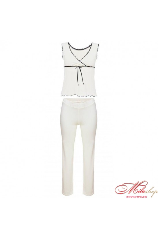 Класична піжама складається з майки та довгих штанів. Виконана з приємної на дотик, легкої тканини, декор – бантики. Колір – молочний.