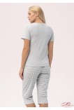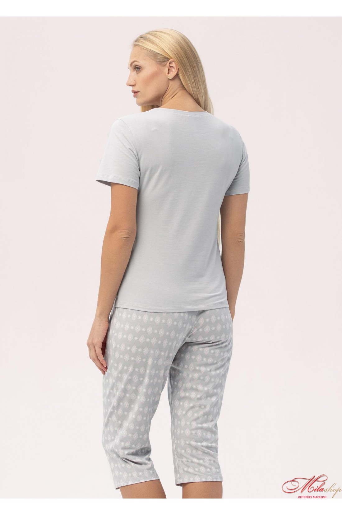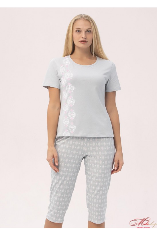 Домашній комплект піжами з капрі та футболкою. Хороший варіант повсякденного одягу для тих, хто віддає перевагу комфортному простому стилю, який не позбавлений нотки чарівності. Футболка з принт від плеча вниз. Капрі з геометричним візерунком білого кольору із рожевими вкрапленнями.
