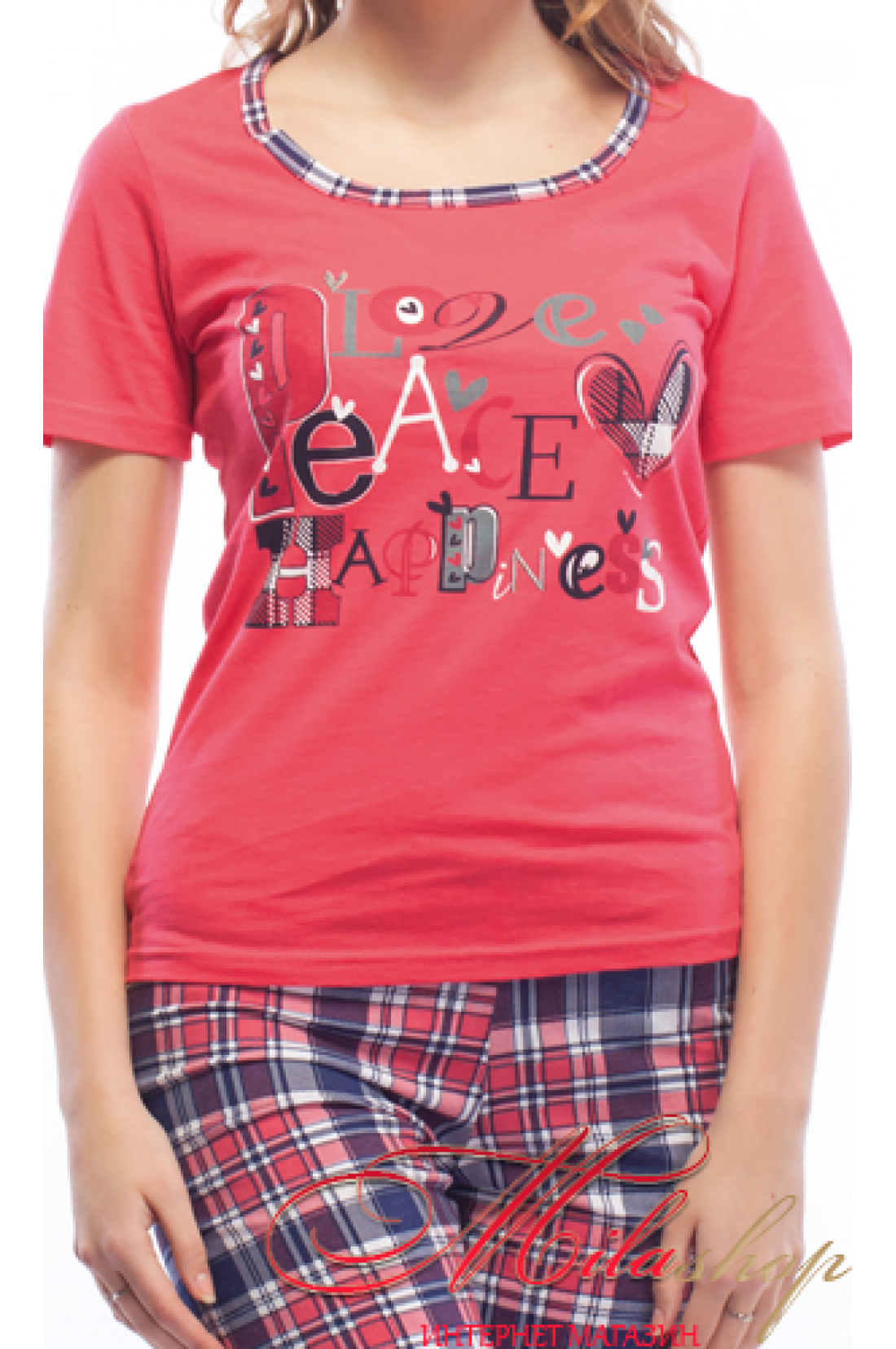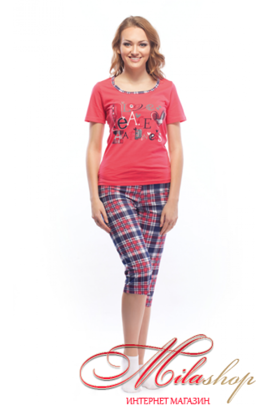 Женская пижама из высококачественного хлопкового полотна. Состоит из принтованой футболки с длинным рукавом и клетчатых капри.