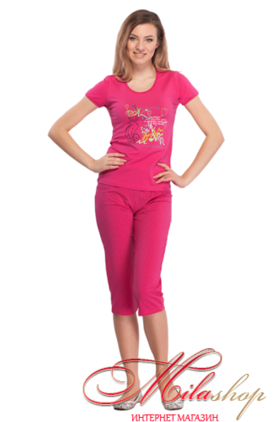 Женская пижама из высококачественного хлопкового полотна. Состоит из принтованой футболки с коротким рукавом и капри в горошек.