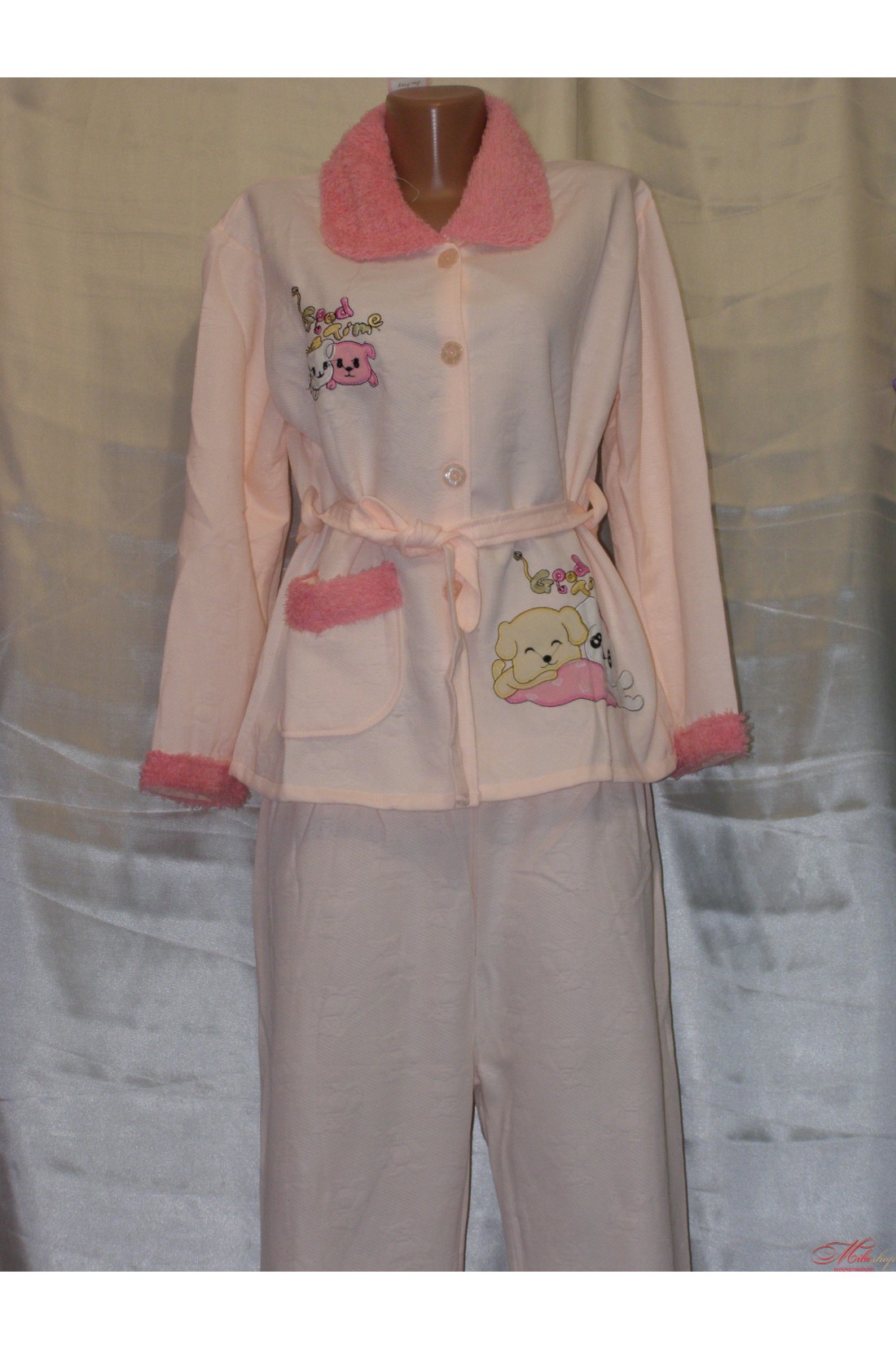 Комфортная пижама из хлопка. Верхняя часть в виде кофты на пуговицах, с пушистыми манжетами и воротником, комплект дополняют штаны выполнены в одном тоне с кофтой. Пояс, с помощью которого можно подчеркнуть талию - изюминка этого комплекта.