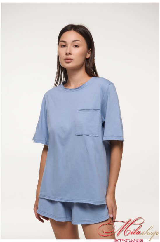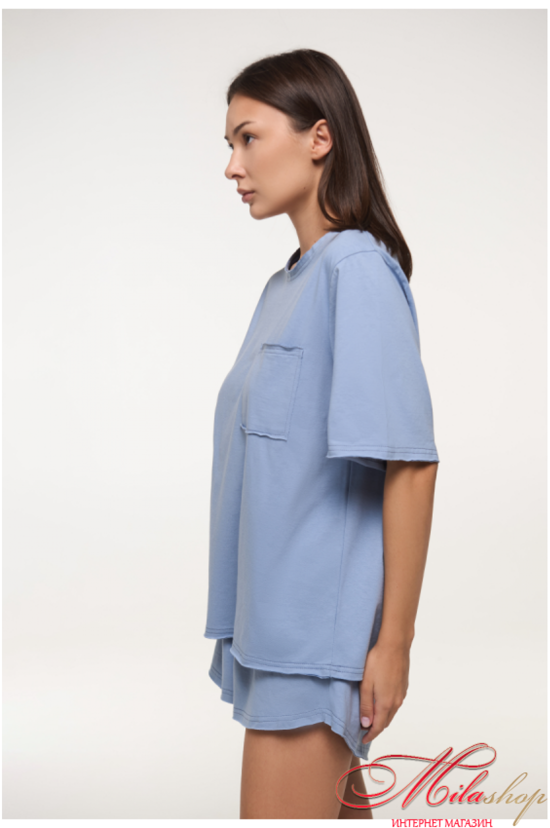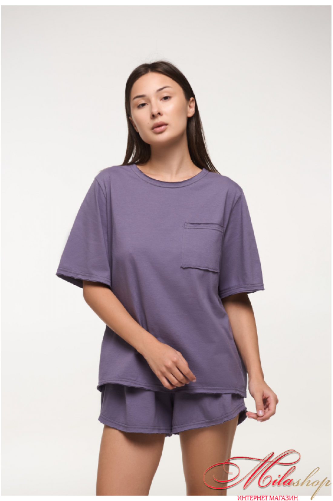 Стильна піжама базової конструкціі - шорти та футболка з бавовни 100%. Футболка має високий комфортний комірець, краї виробів необроблені та декоровані додатковим кантом, що надає ігривий ефект. Футболка декорована кишенею.