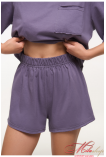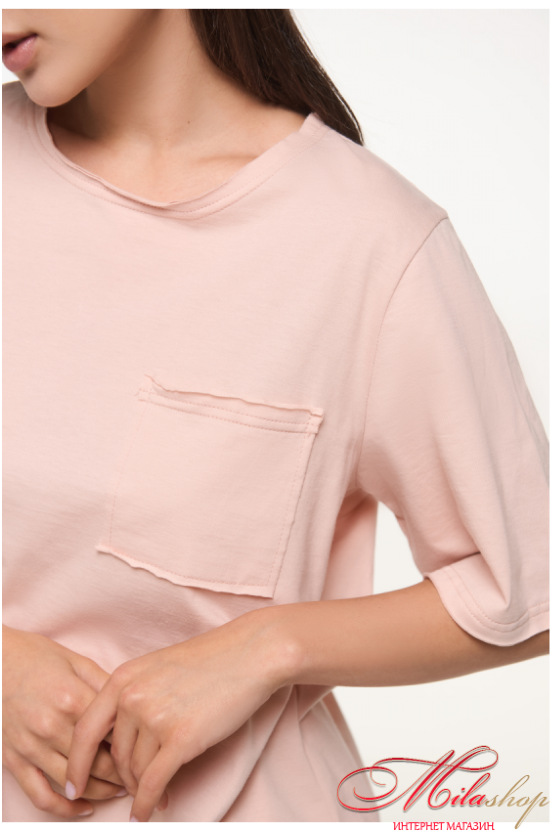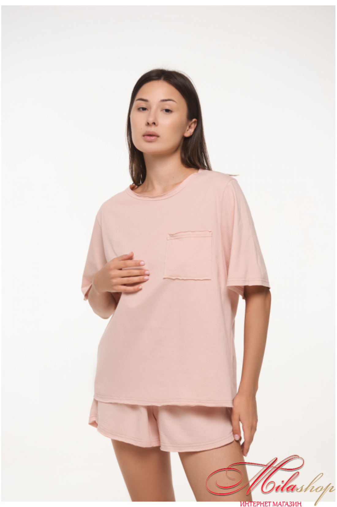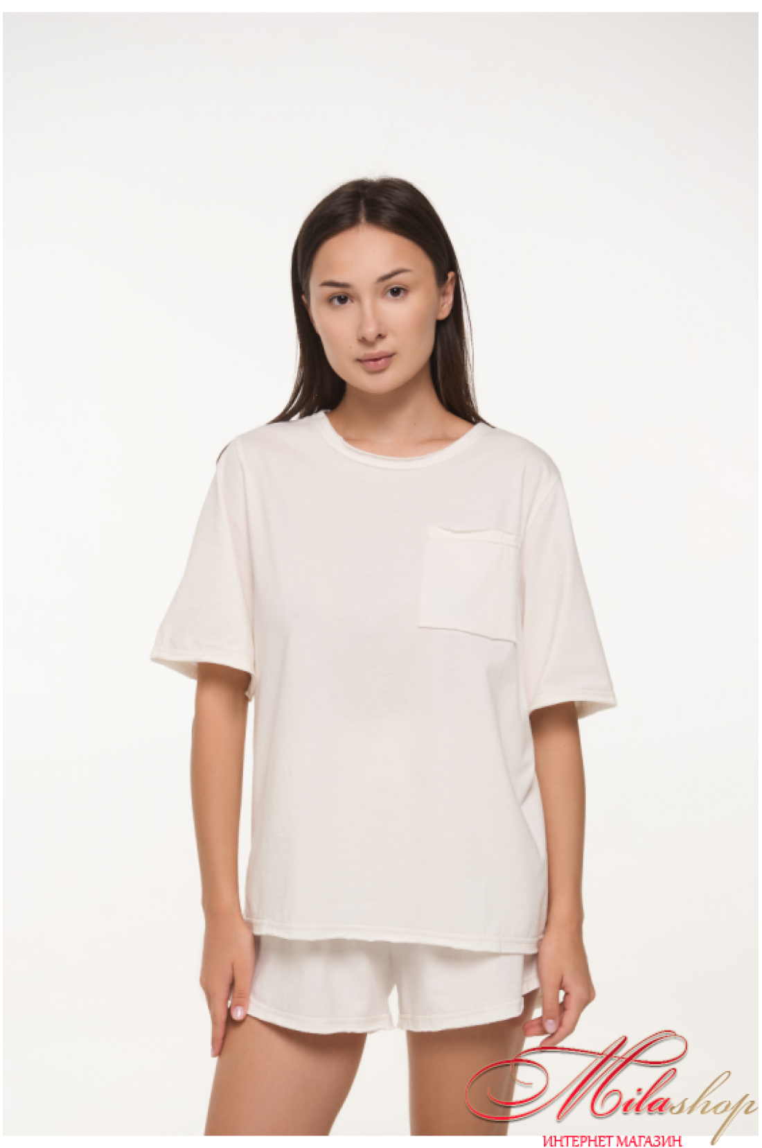 Стильна піжама базової конструкціі - шорти та футболка з бавовни 100%. Футболка має високий комфортний комірець, краї виробів необроблені та декоровані додатковим кантом, що надає ігривий ефект. Футболка декорована кишенею.