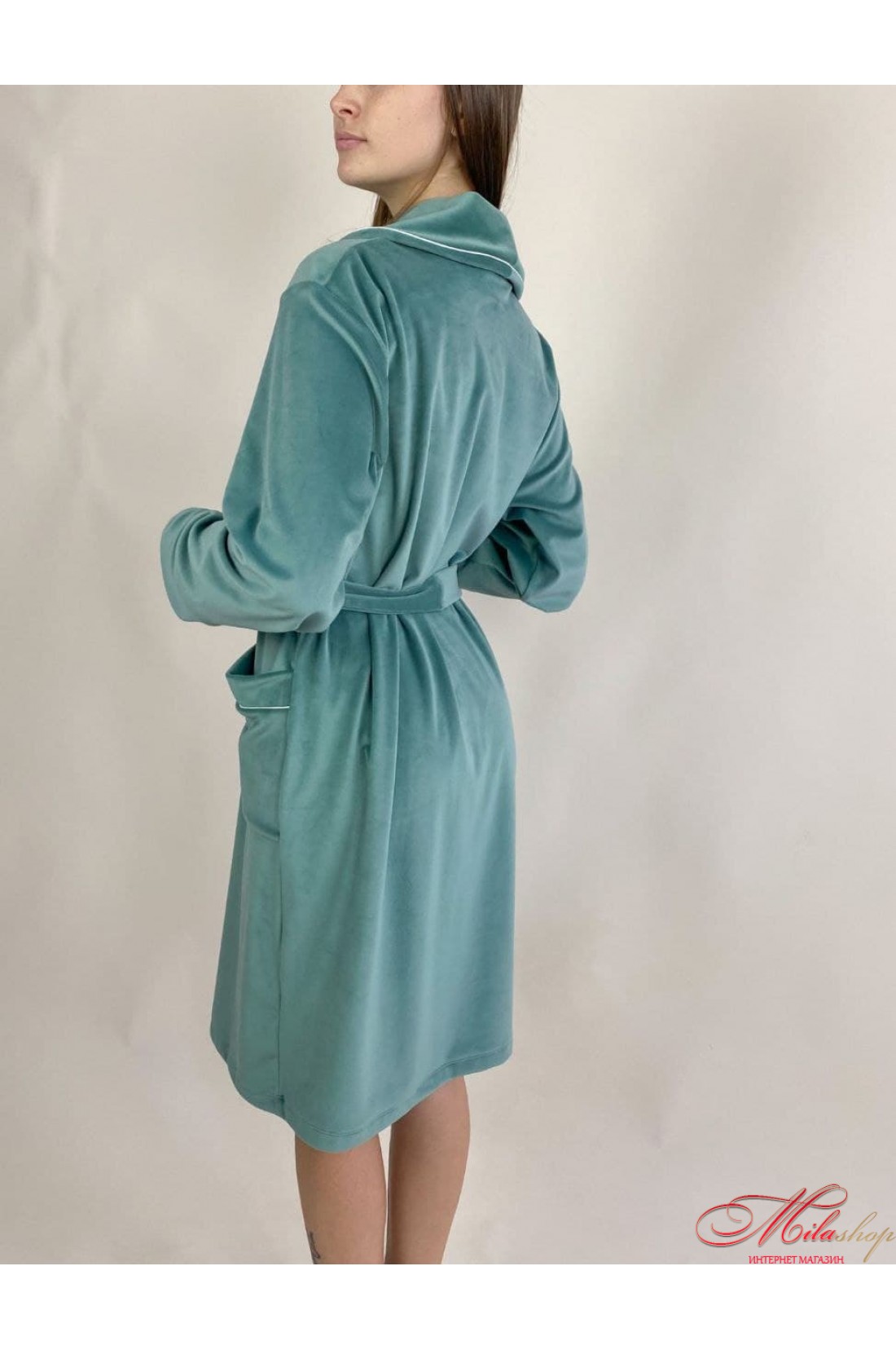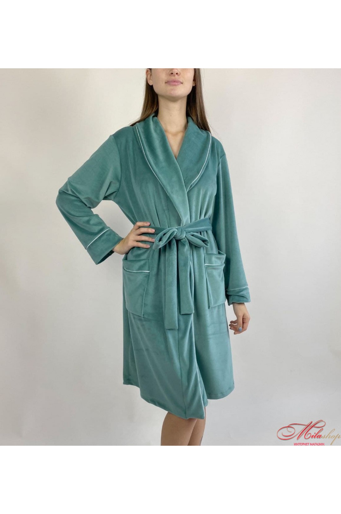 Велюровий халат із двома кишенями, середньої довжини з пояском. На підворітті красива прикраса у вигляді білої стрічки.