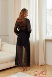 Довгий пеньюар із прозорої делікатної мікросітки, прямі довгі рукави з мереживом унизу, крій на запах дозволяє регулювати посадку по фігурі, що зав'язується на талі поясом.