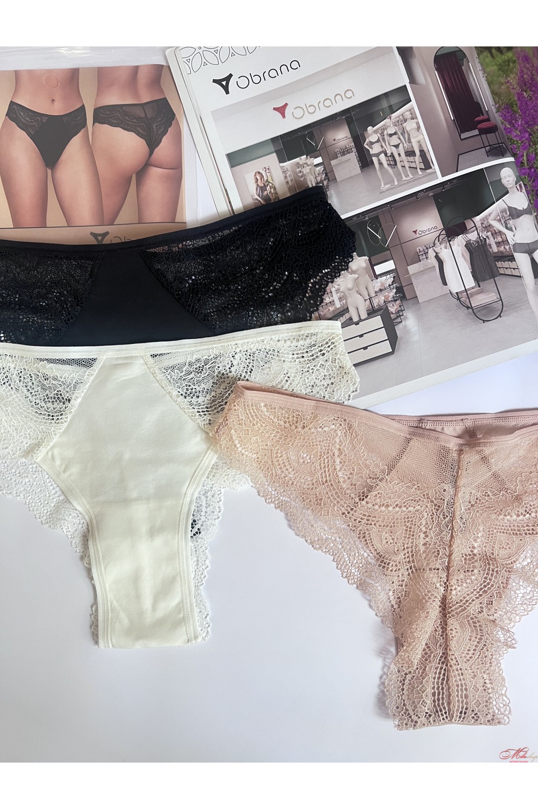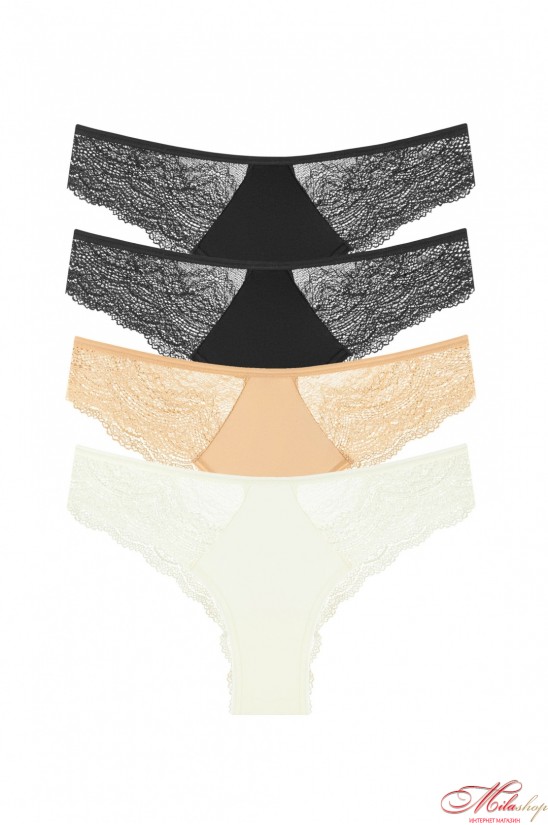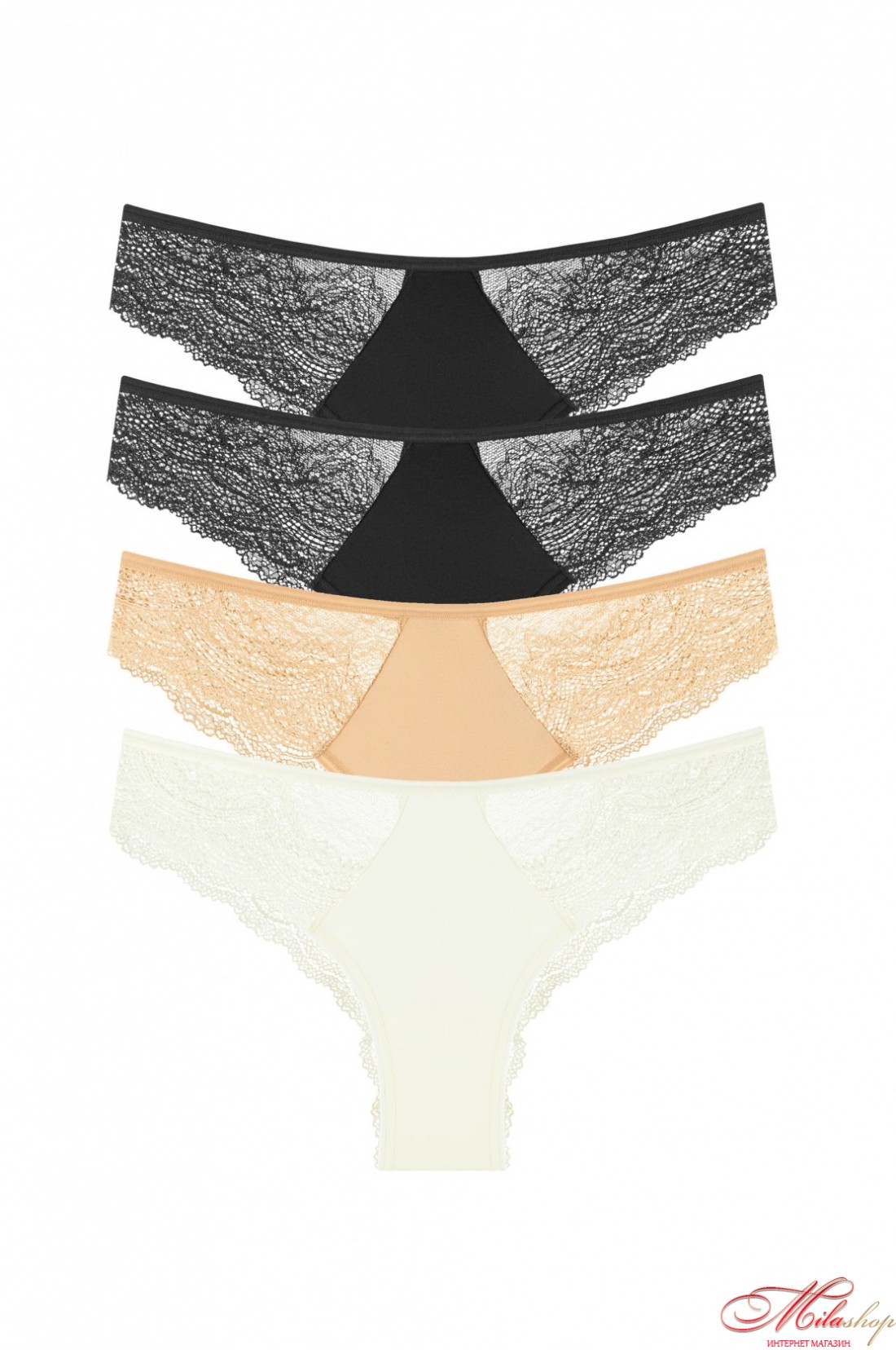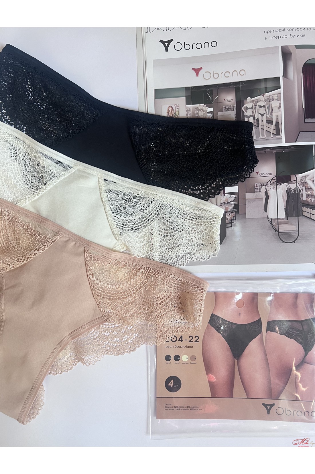 Комплект складається з 4 трусиків одного розміру: 2шт чорний, 1шт бежевий, 1шт шампань. Чудові трусики бразиліана Obrana виконані з бавовняного полотна з мереживом. Середня – завищена лінія талії. Дуже зручні м'які плоскі шви.