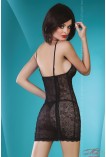 Модель выполнена из просветляющейся черной сеточки, по всей поверхности щедро усыпанной фантастическим орнаментом. Мягкая чашка надежно поддерживается регулируемыми бретелями. Глубокое манящее декольте переходит в изысканную шнуровку, увенчанную бантиком над самим пупком. Длина мини, покрой облегающий. Дополнительным украшением служат кружевные тесемки с волнообразными краями на лифе, подоле и продольных швах. Последние, кстати, образуют эффектную и многими любимую форму песочных часов! Сплошное загляденье! В комплекте идут маленькие черные стринги.