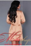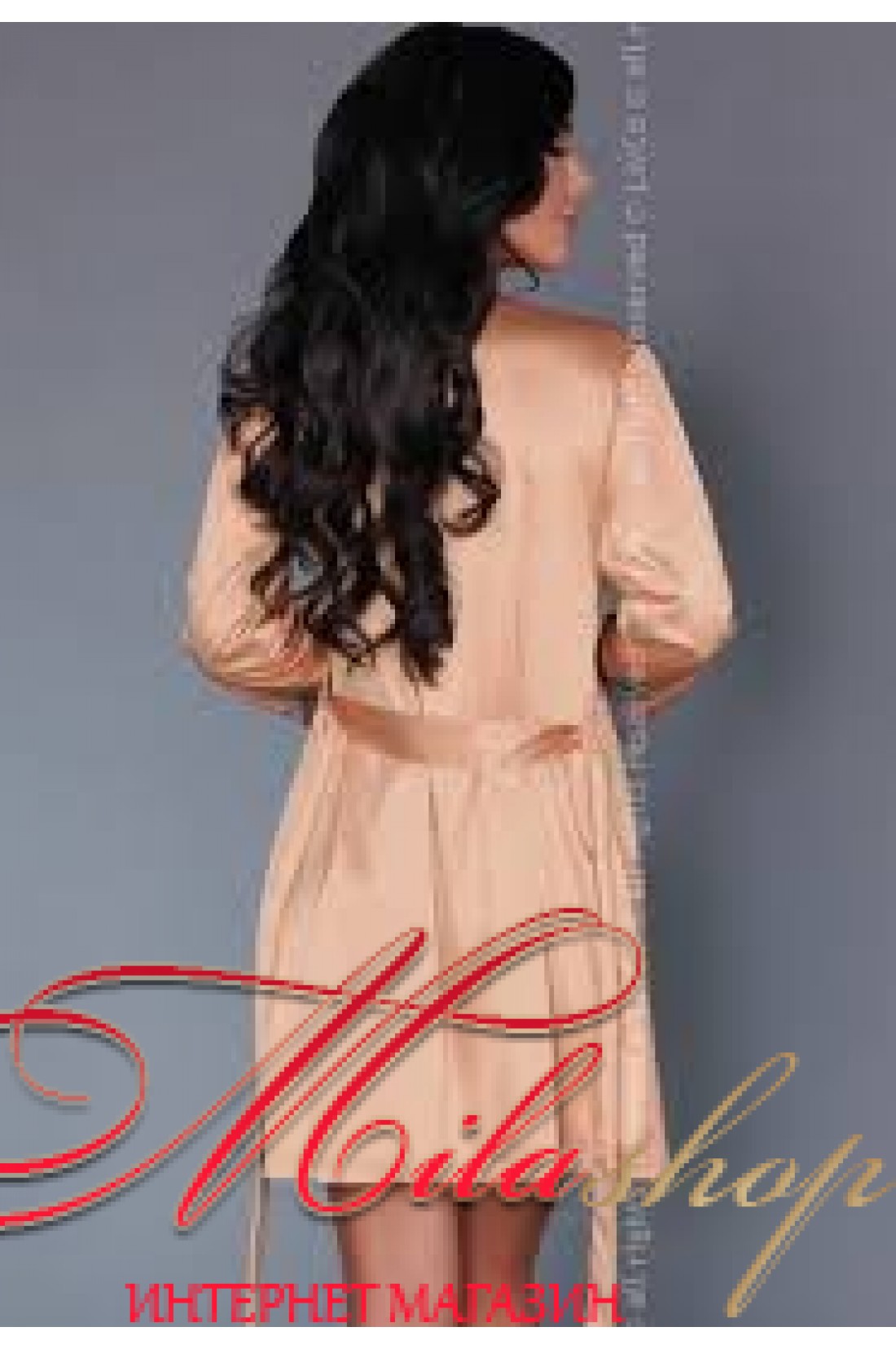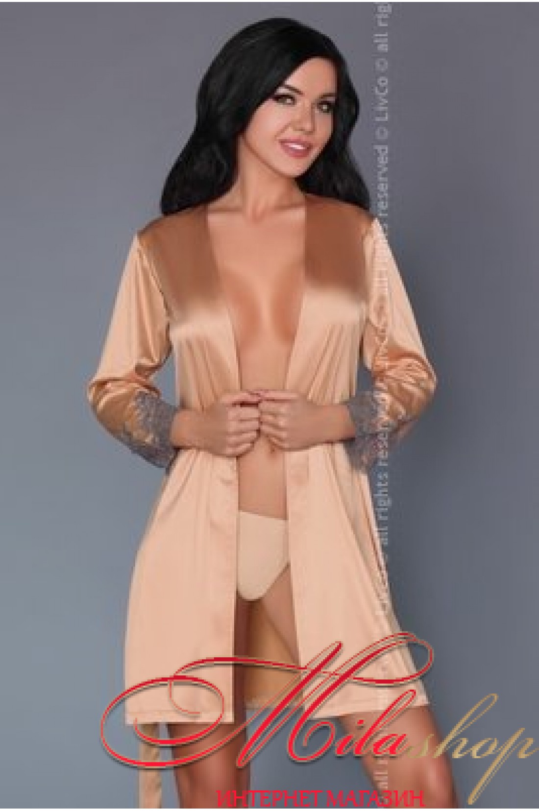Шикарный короткий халат длиной до середины бедра, на запах под поясок. По краям рукавов - декор из кружева с цветочными мотивами. Трусики стринги с кружевными бочками дополняют халат.