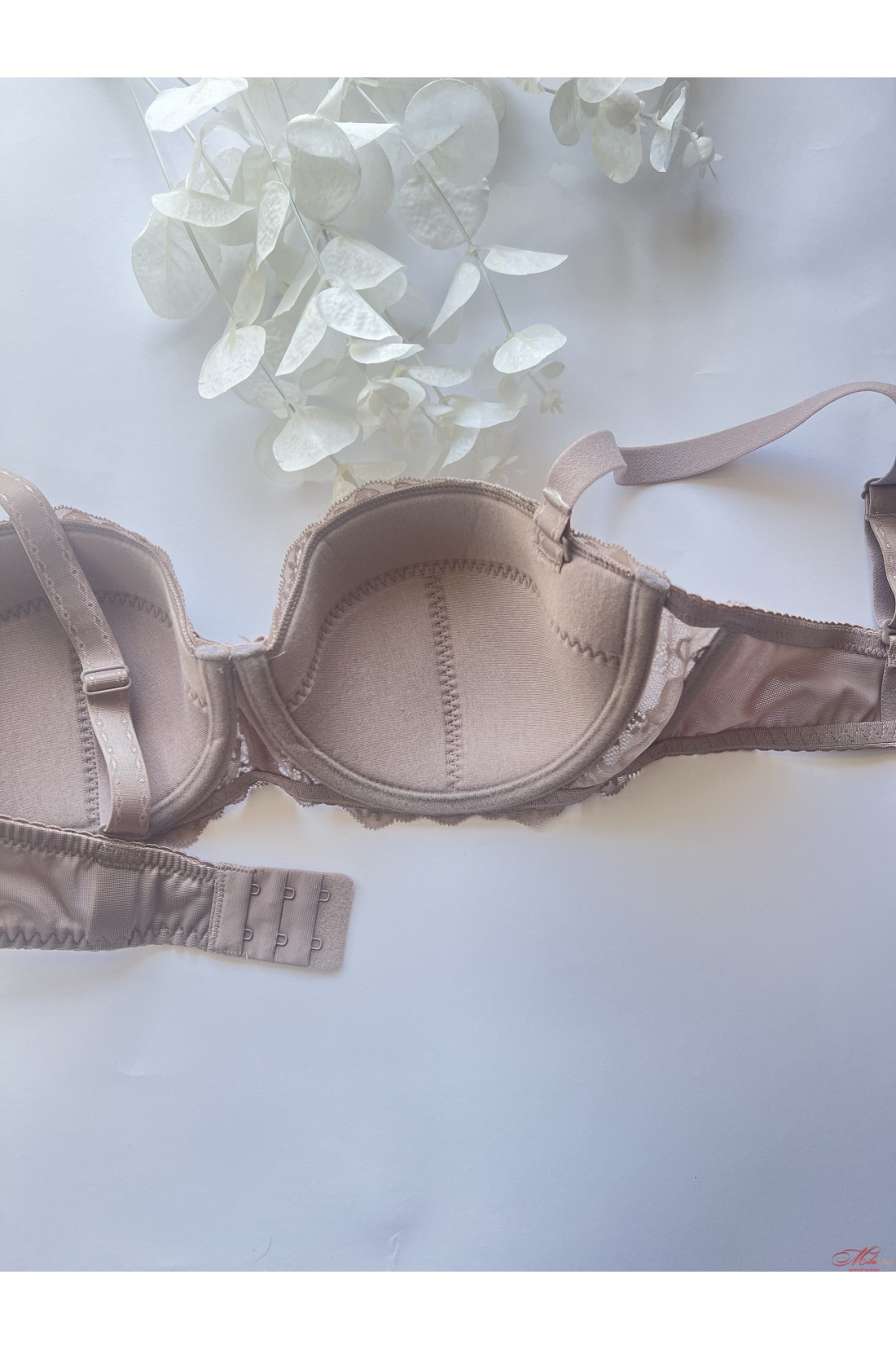 Бюстгальтер з тонкими поролоновими чашками на кістки. Виконаний з еластичного полотна та елегантного мережива. Бретели регулюються по всій довжині. Без пуш-ап. На бавовняній основі.