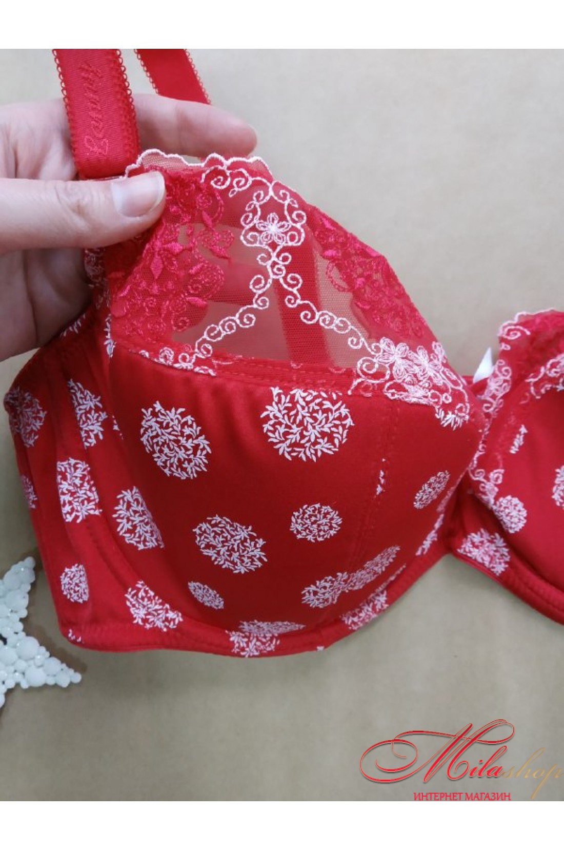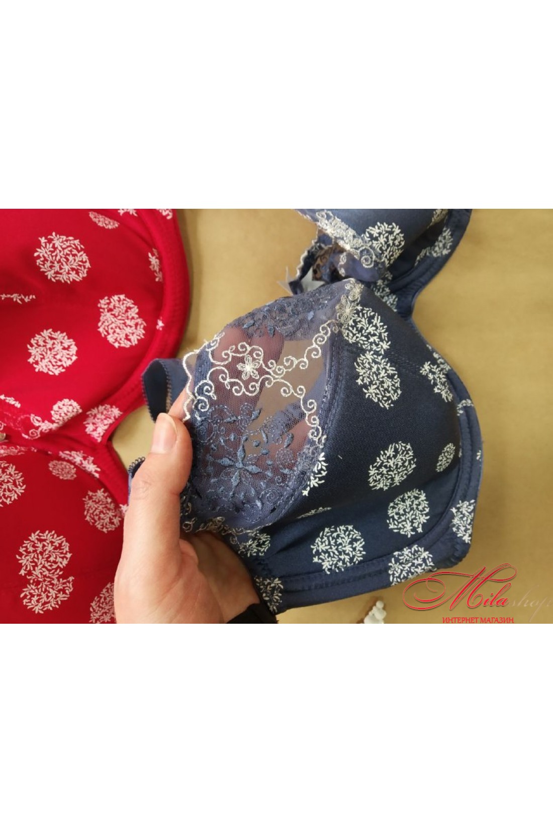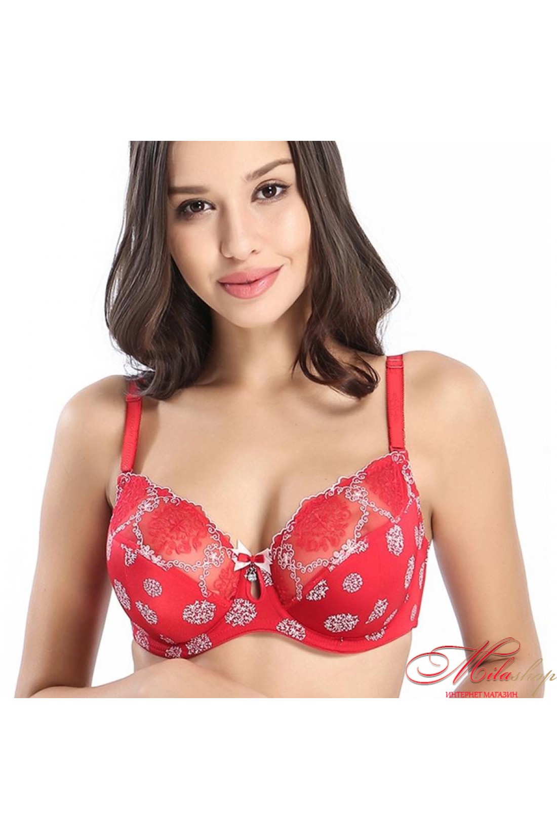 Бюстгальтер напівпоролон, зі знімними бретелями. Верхня частина чашечок прикрашена вишивкою.