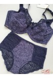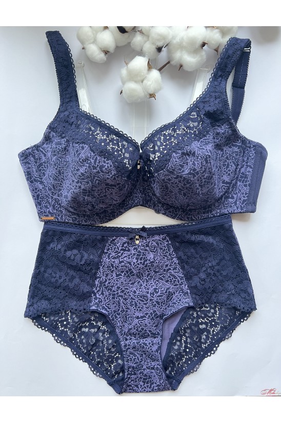 Бюстгальтер на кісточках, м'яка тканинна чашка (слабко розтягується), без поролону. Усередині чашки є додаткова тканинна бічна підтримка. Чашка прикрашена еластичним мереживом, гладка спинка, незнімні широкі бретелі, застібка в три ряди на 2 гачки. За рахунок своєї конструкції бюстгальтер добре тримає груди великих розмірів. Трусики з високою лінією талії. Виконані з бавовни з мереживом.