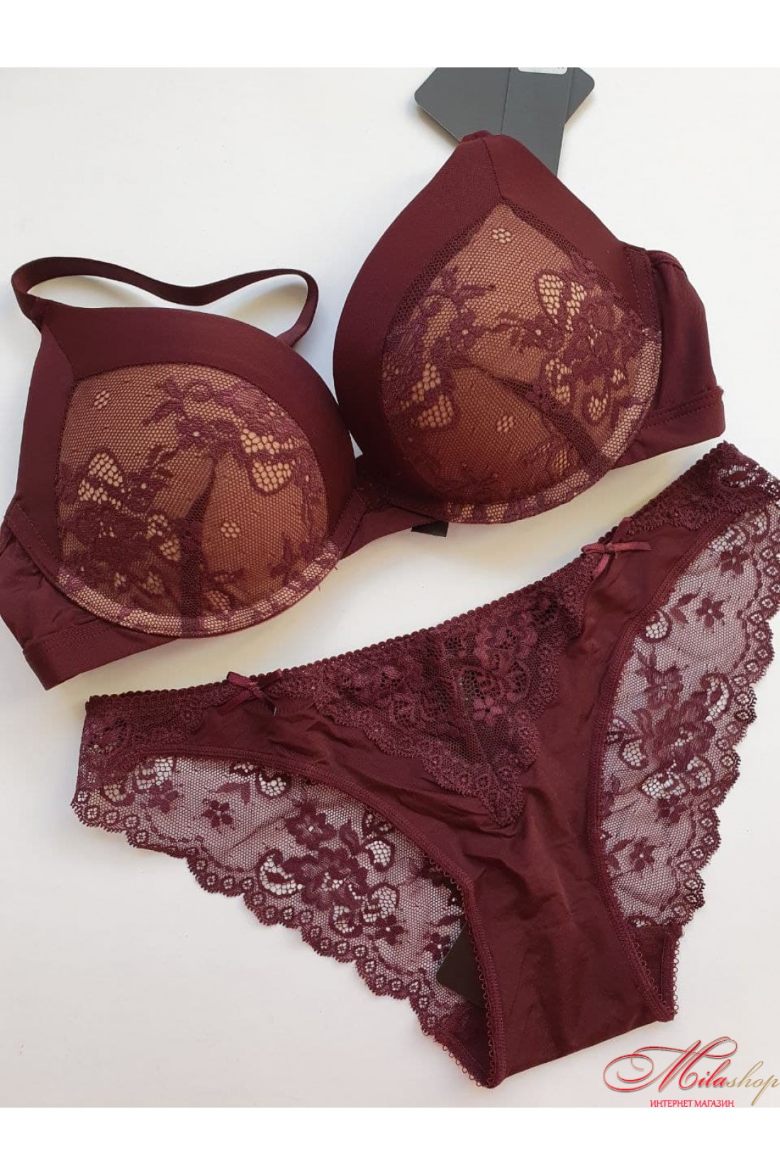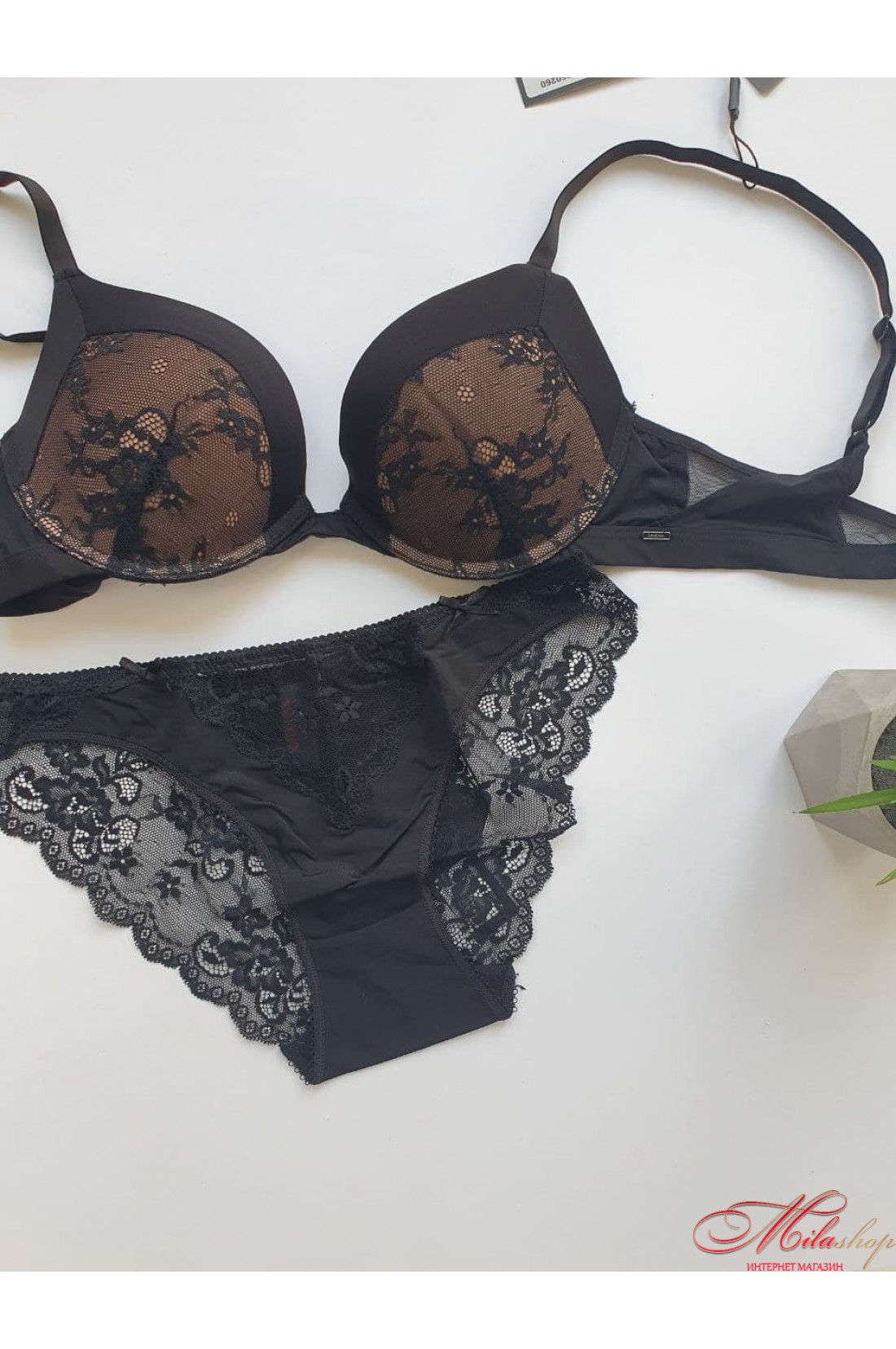 Дивовижний комплект, складається з бюстгальтера з комфортним пуш-ап та мереживних трусиків. Виконаний із мережива, сітчастого полотна. Бретели регулюються по довжині. Трусики сліпи, ластка бавовна.