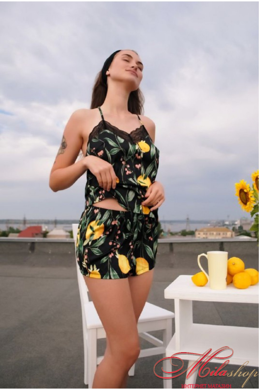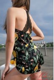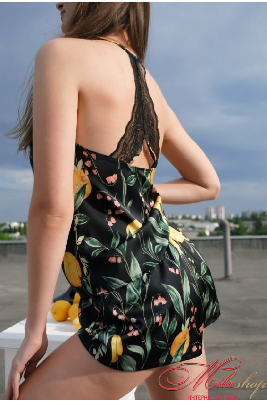 Комплект выполнен из нежного шелка с кружевной отделкой. Украшен оригинальным принтом.