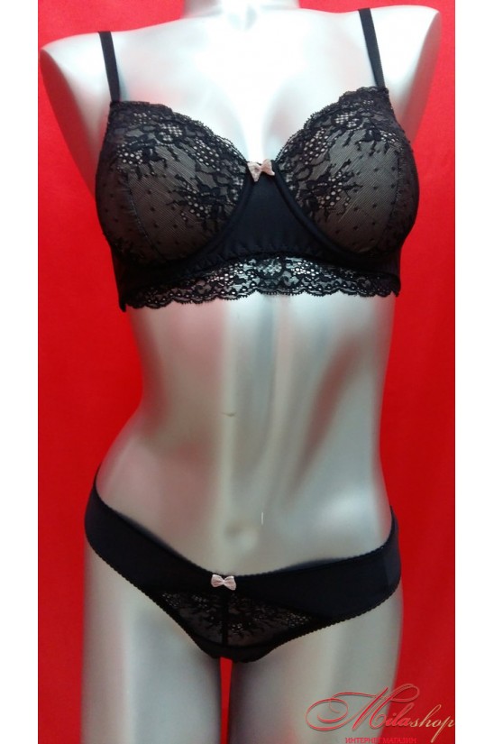 Комплект белья с кружевными трусика-бразалиана. Мягкая чашка на косточках с бежевой подкладкой. Боковая косточка. Бретели не съемные.