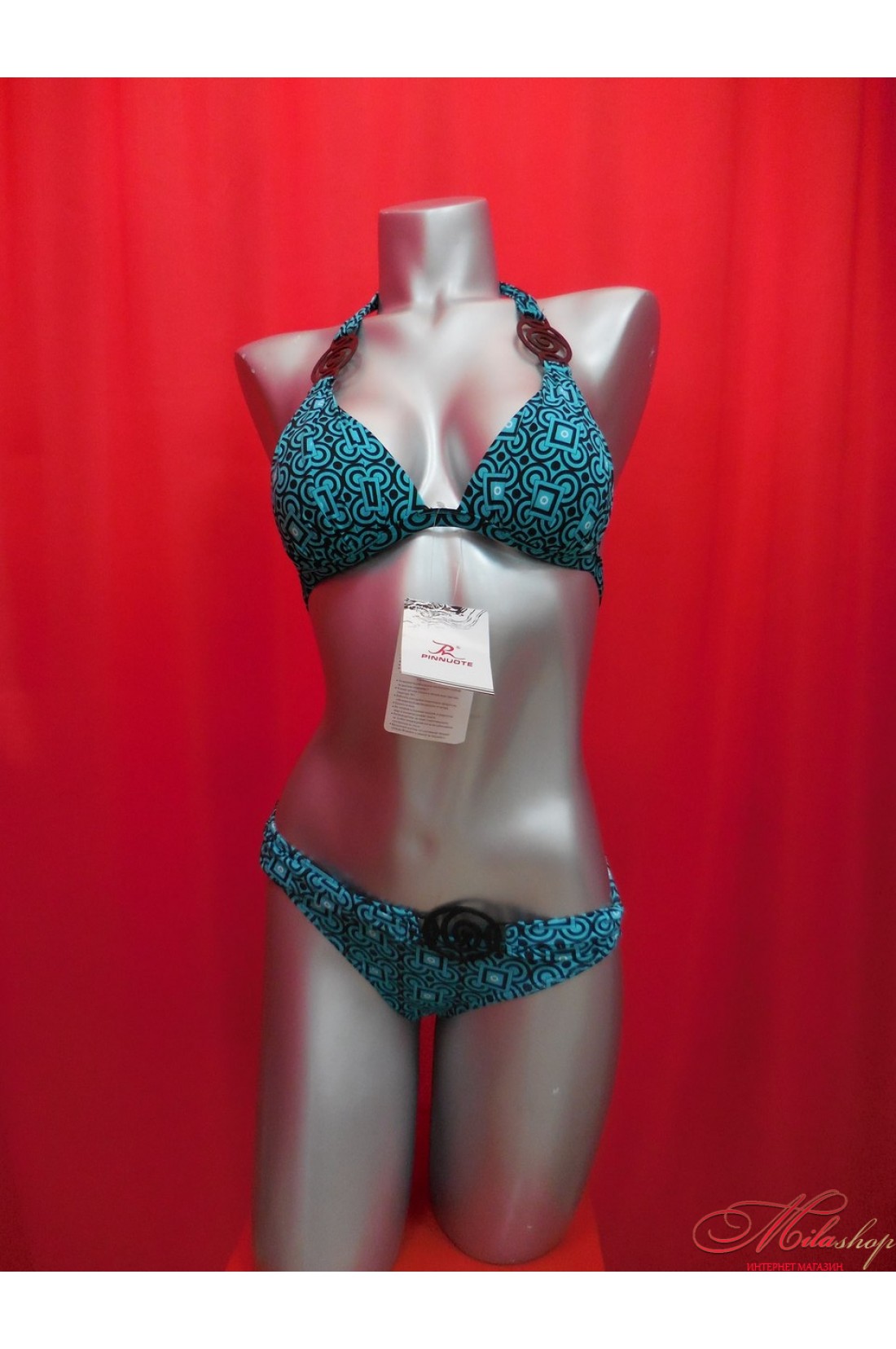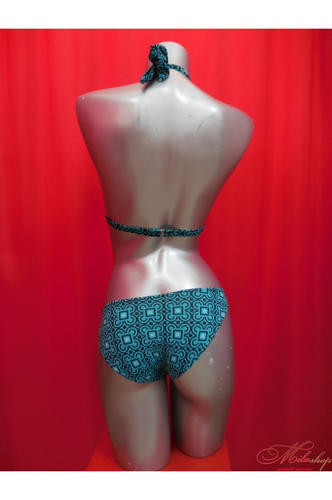 Купальник состоит из формованных чашек-"шторок". Украшен оригинальными узорами в красивом сочетании бирюзового и черного цвета. Трусики слипы с низкой линией талии, украшены поясом с декоративным элементом. Размер европейский.