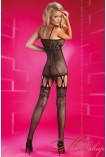 Выполнен из черной сеточки, мягко облегающей женские формы. Выглядит как мини-пеньюар и чулки, соединенные фигурными лентами-пажами. Но все это цельное произведение на тонких аккуратных бретелях с симпатичными узорами на бюсте и сверху чулок. Кстати, в модели применен один тайный прием, призванный стройнить силуэт своей хозяйки – вертикальные уплотненные швы на спинке и животике. Выглядит невероятно