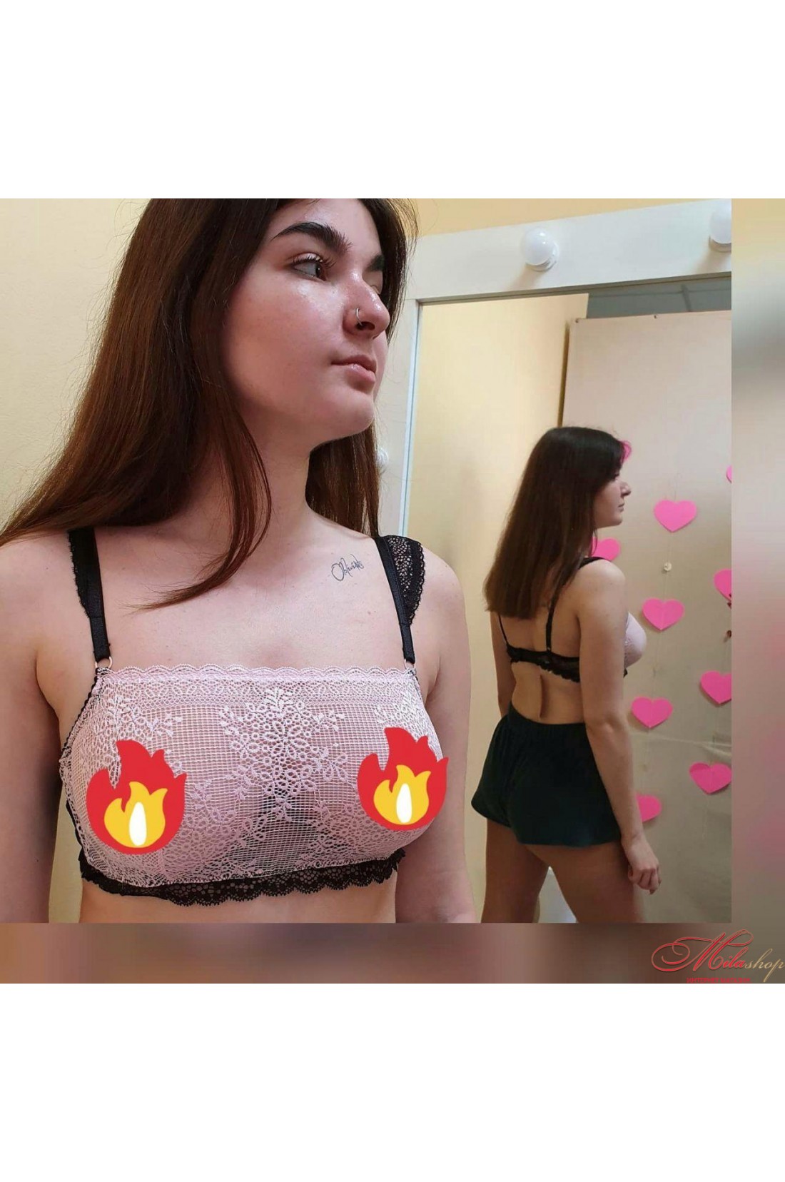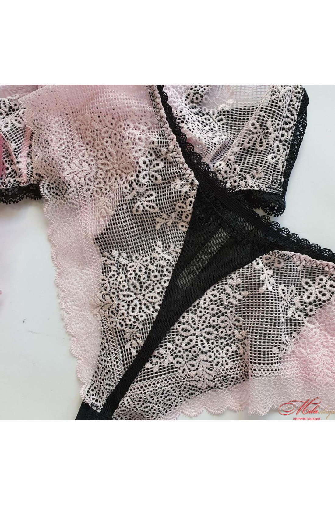 Очень оригинальный комплект от торговой марки Sambario. Бюст сделан в виде бандо на косточках, - состоит из розовой полупрозрачной ткани спереди, весь остальной каркас бюста, включая кружевные регулируемые бретели, - чёрного цвета. Трусики-бразилианы сделаны в виде черных стринг с добавлением розового мягкого кружева. Трусики доступны в размерах S, M, L.
