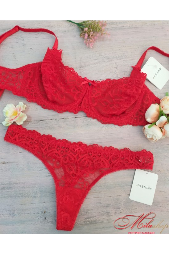 Классический комплект из потрясающего красного кружева состоит из бюстгальтера и трустков стринг.
