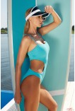 Двусторонний слитный купальник с асимметричным кроем и открытой спиной. Одна сторона из фактурной микрофибры, другая — из гладкой микрофибры такого же цвета в мелкий белый горошек. Отлично сидит на фигуре и хорошо подчеркивает изгибы талии и бедер. Лиф с тонкими несъемными поролоновыми вкладышами. Бретели через плечи (широкая бретель несъемная, узкая - съемная). Классические вырезы для ног.