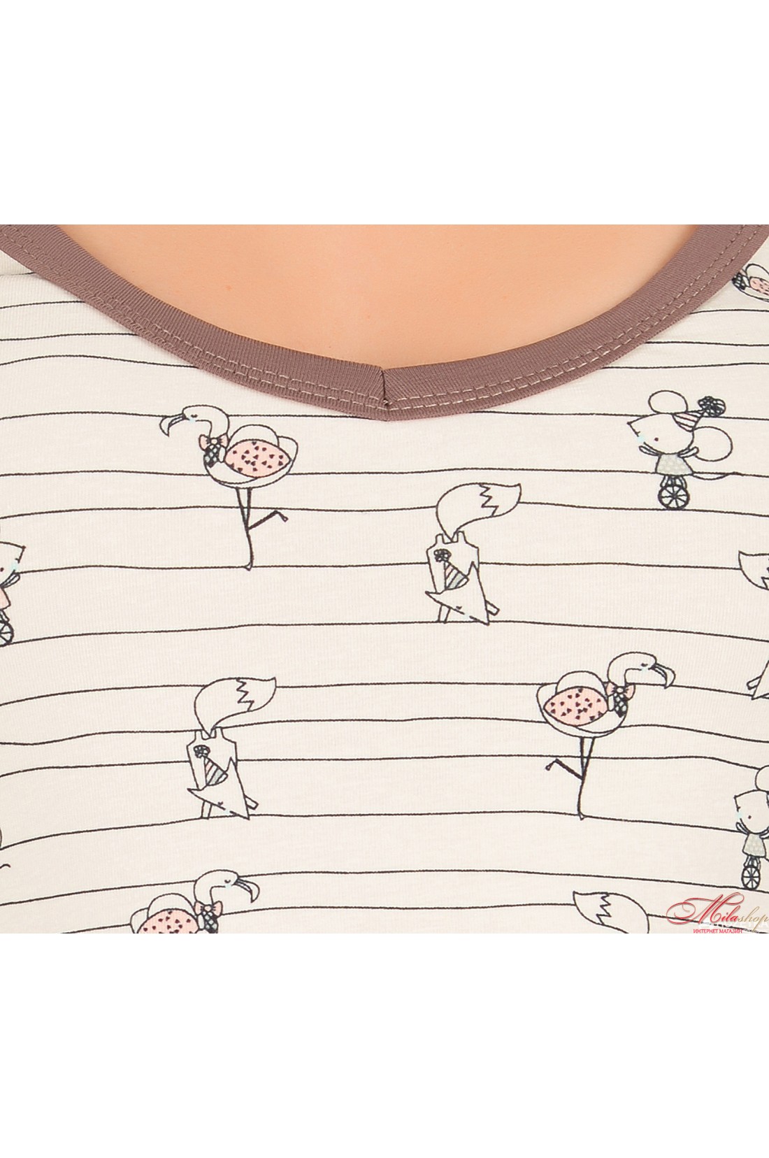 Сорочка ночная полуприталенный силуэта до середины колена, Слегка расширенная книзу, с тонкими бретелями, сзади сделаными борцовкой и круглым вырезом. Изготовлена из приятной на ощупь хлопковой ткани нежно-кремового цвета в веселый принт.