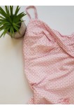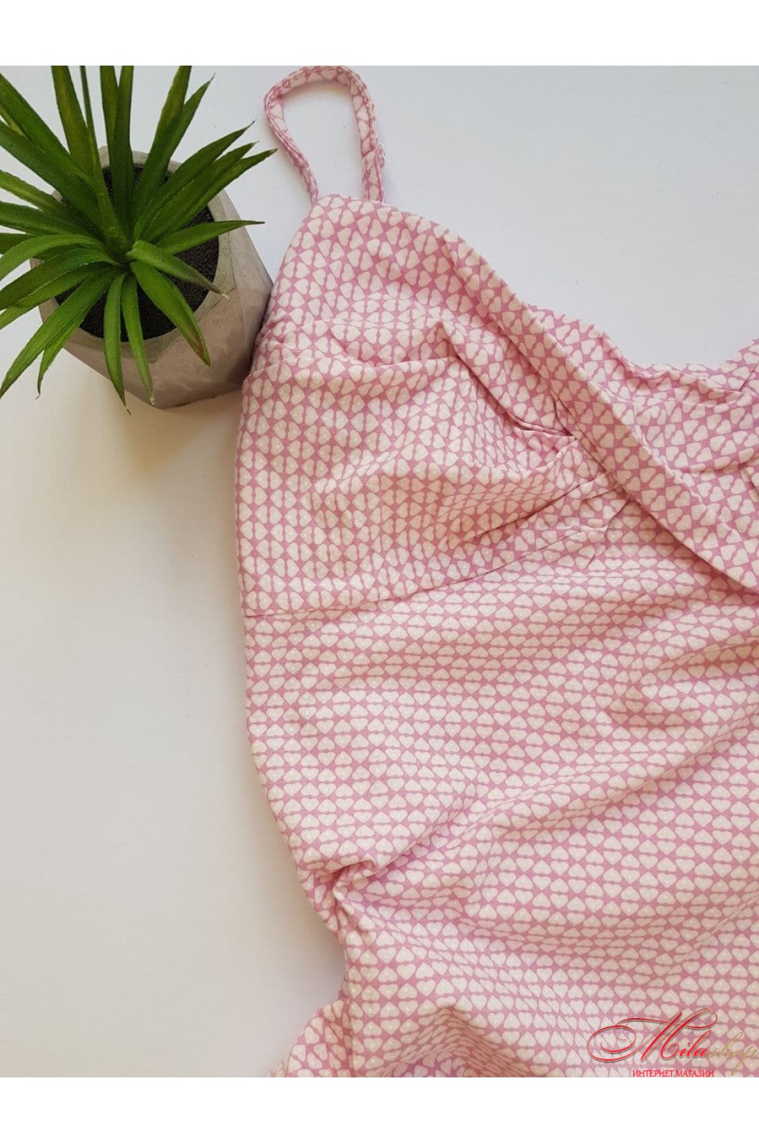 Спереди модель украшена перекрещивающейся кокеткой, за счет чего изделие удачно садится и отлично смотрится в области груди. Сорочка из хлопка прилегающего кроя на тонких бретельках. Принт мелкие сердечки по всей длине.