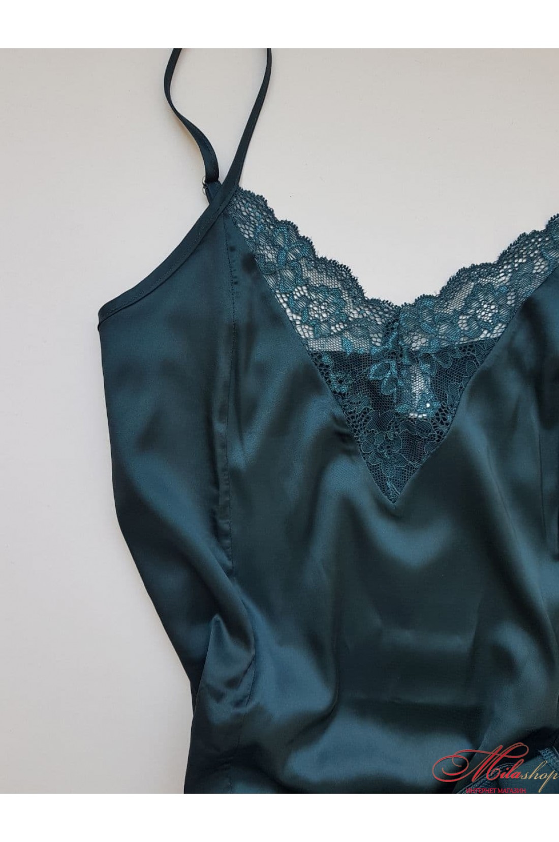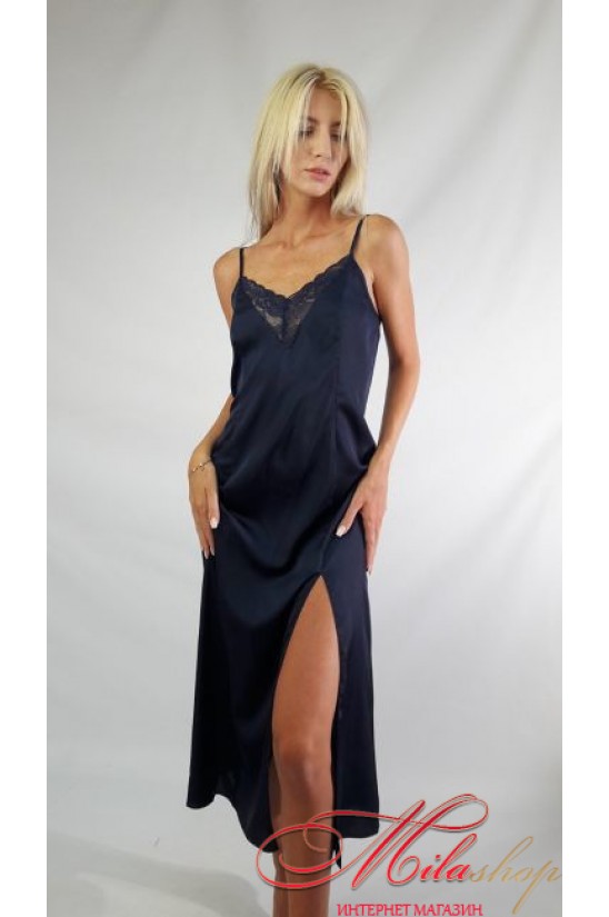 Утонченное однотонное платье из сатина и кружева. Ткань мягкая, комфортная, красиво струится и выглядит дорого. Вырез декольте декорирован кружевом. Тонкие бретели с регуляторами длины. Низ платья с разрезом.