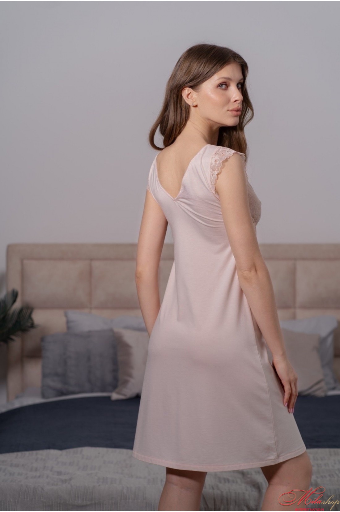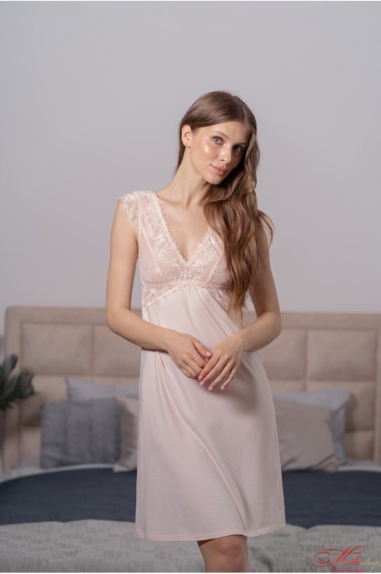 Прекрасна сорочка виготовлена з м'якого полотна і прикрашена красивим мереживом, довжина до коліна. Красиві лінії декольте з V-подібним вирізом.